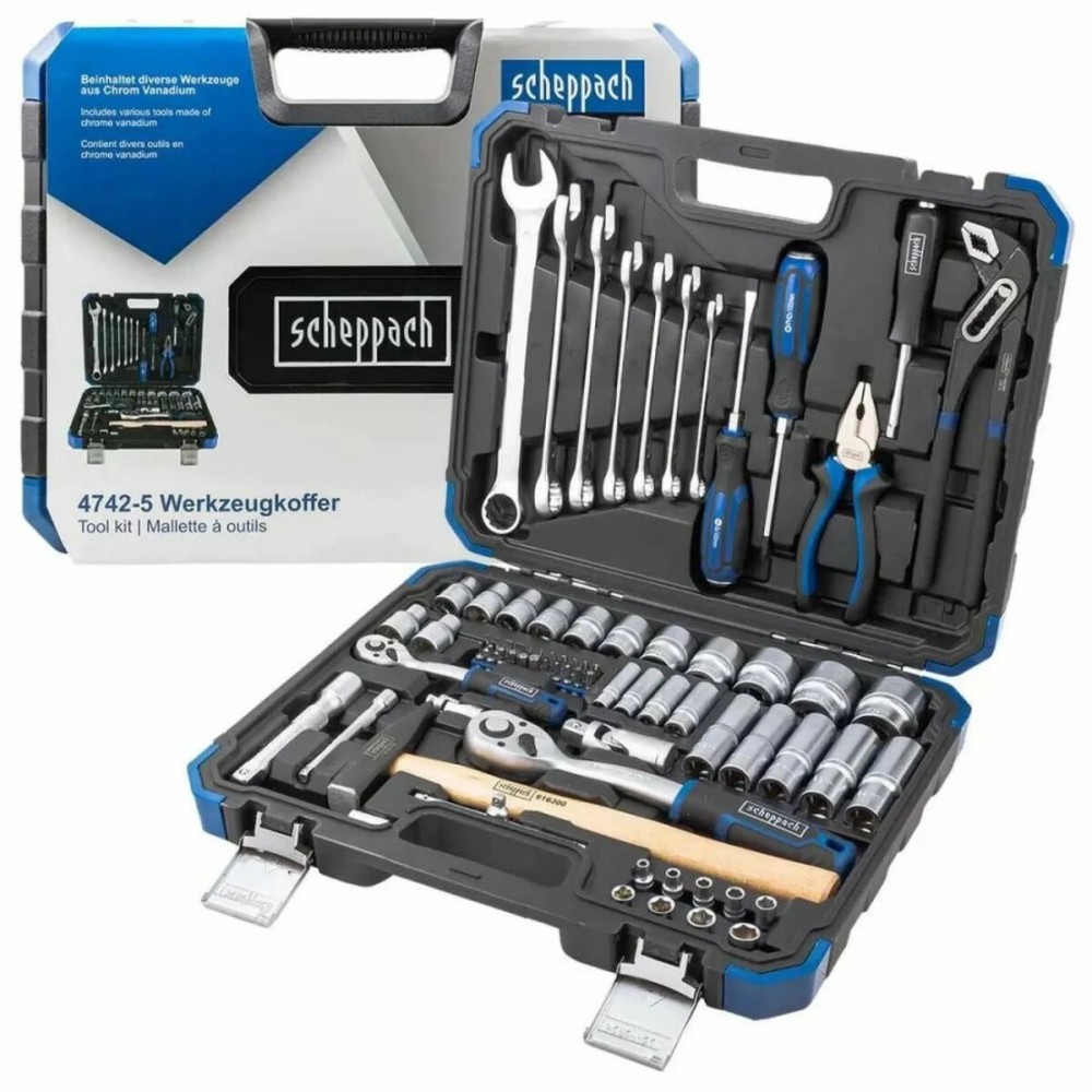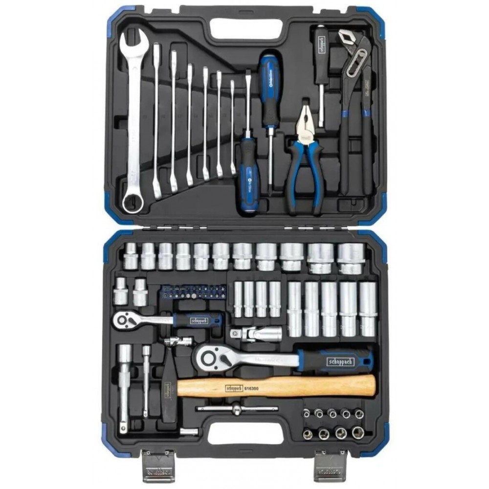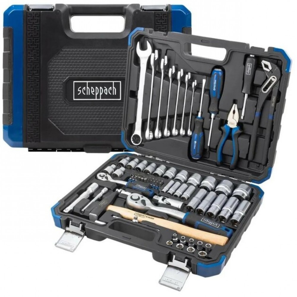 - Торцеві головки 1/2" (6-гр.): 10, 11, 12, 13, 14, 15, 17, 19, 22, 24, 27, 30, 32 мм; - глибокі торцеві головки 1/2" (6-гр.): 14, 15, 17, 19, 21 мм; - тріскачка 1/2"; - кардан 1/2"; - подовжувач 1/2"; - комбіновані гайкові ключі: 10, 12, 13, 14, 17, 19, 22 мм; - комбіновані плоскогубці, 6"; - переставні кліщі, 10"; - викрутки: PH2x100, SL6x100; - молоток, 300 гр.; - торцеві головки 1/4" (6-гр.): 4, 5, 6, 7, 8, 9, 10, 11, 12 мм; - глибокі торцеві головки 1/4" (6-гр.): 8, 10, 12, 13 мм; - бітотримач: 1/4"(F)x1/4"(F); - тріскачка 1/4"; - кардан 1/4"; - рукоятка для головок 1/4", 6"; - вороток Т-подібний 1/4", 115 мм; - подовжувач 1/4", 4"; - біти 1/4": T10, T15, T20, T25, T30; - пластиковий кейс