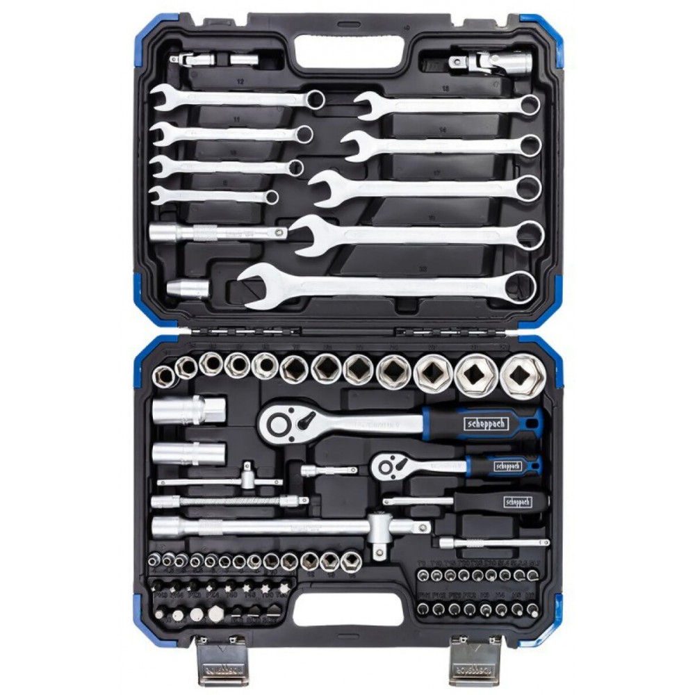 - Головки 1/2": 14, 15, 16, 17, 18, 19, 20, 21, 24, 27, 30, 32 мм; - тріскачка 1/2", 72T; - головки для свічок запалювання 1/2": 16 та 21 мм; - подовжувачі 1/2": 5 та 10"; - адаптер на три напрями 1/2"; - з'єднувач для біт 1/2": 8 мм; - універсальний шарнір 1/2"; - головки 1/4": 4, 4.5, 5, 5.5, 6, 7, 8, 9, 10, 11, 12, 13, 14 мм; - тріскачка 1/4", 72T; - подовжувачі 1/4": 2" та 4"; - гнучкий подовжувач 1/4"; - універсальний шарнір 1/4"; - вороток Т-подібний 1/4"; - вороток 1/4"; - викрутка-бітотримач 1/4"; - з'єднувач для біт 1/4"; - біти, 30 мм: PH3, PH4; PZ3, PZ4; SL8, SL10, SL12, H8, H10, H12, H14; T40, T45, T50, T55; - біти 1/4": T8, T10, T15, T20, T25, T30; PH1, PH2; PZ1, PZ2; H3, H4, H5, H6; - комбіновані гайкові ключі: 8, 10, 11, 12, 13, 14, 17, 19, 22 мм; - пластиковий кейс
