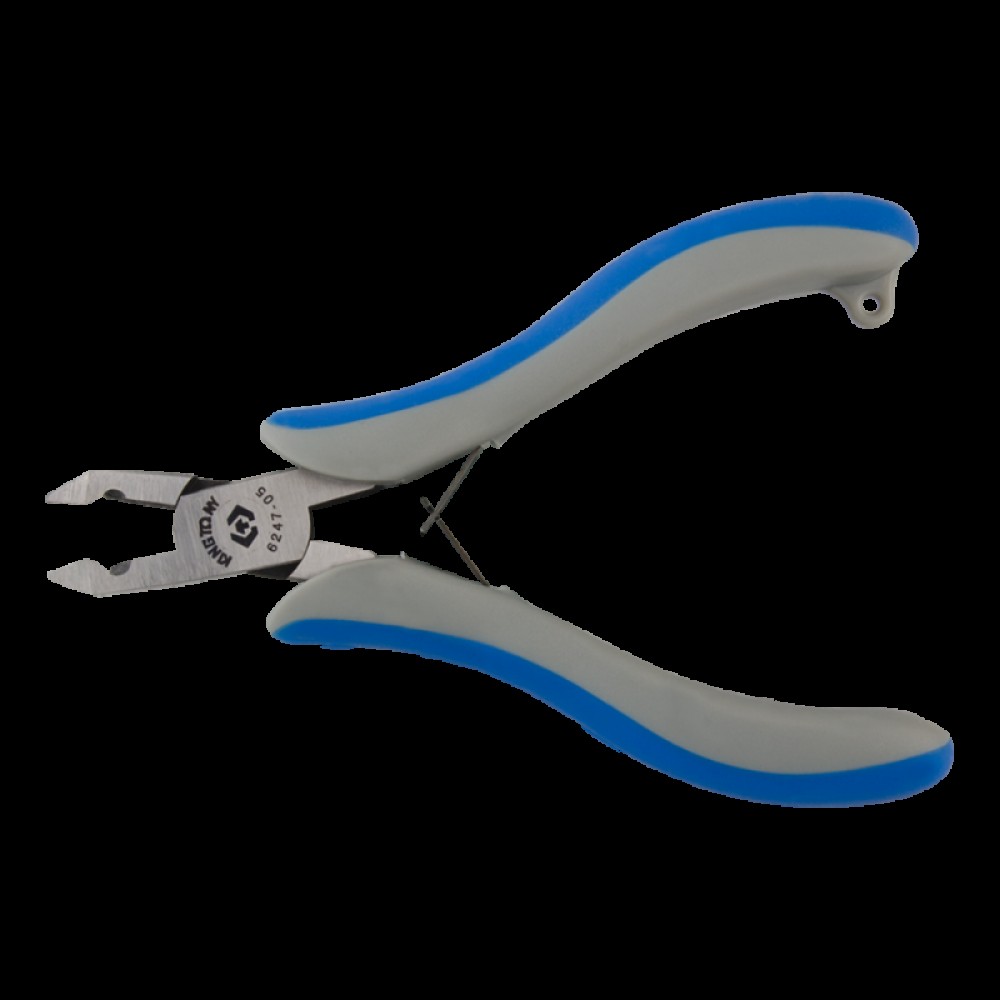 Різання проводів та дроту, тонких металевих прутків та дрібних елементів деталей. Галузь застосування: Проведення електромонтажних робіт, ремонт електротехніки та обладнання, збирання електричних щитів та плат. особливості: • Спеціальне заточування ріжучих кромок «в нуль» для точних робіт з електронікою; • Індукційне загартування; • Поворотна пружина. Технічні характеристики: Тип інструменту бокоріз діагональний Поворотна пружина є Діаметр різання, мм: - алюміній 1 - мідь 0,5 Параметри ріжучих кромок, мм: - Розмір A 11,4 - Розмір B 19,4 - Розмір C 7,5 - Розмір D 5,5 - кут α 45 ° Матеріал рукояток PP+TPR (поліпропілен, термопластична гума) Довжина загальна, мм 125 Вага, кг 0,073