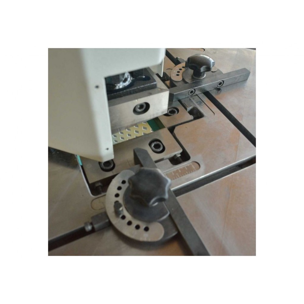 Для точної різки верхній стіл верстата забезпечений Т-образними пазами і оснащений системою автоматичного регулювання товщини щупа, яка не вимагає окремого регулювання для різання листів різної товщини.
