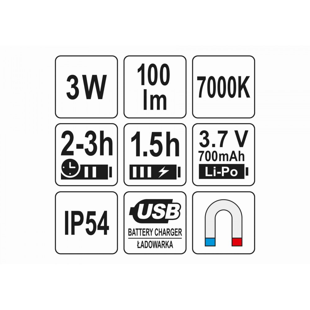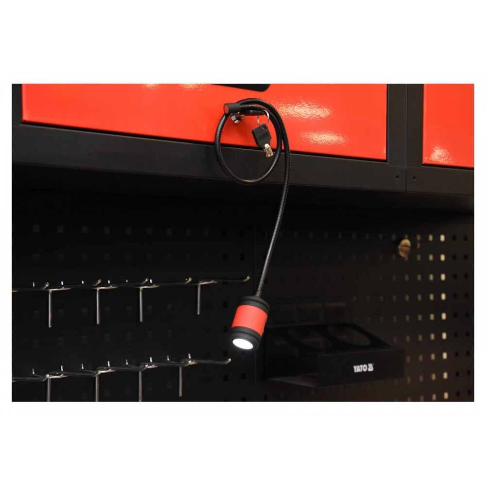 Універсальна світлодіодна лампа з гнучким тримачем YATO YT-08516 зі світловіддачею 100 лм. Її універсальність можливе завдяки довгому гнучкому тримачеві з магнітним наконечником. Можна використовувати, як і настільну лампу, робочий прожектор або світильник для майстерні.
