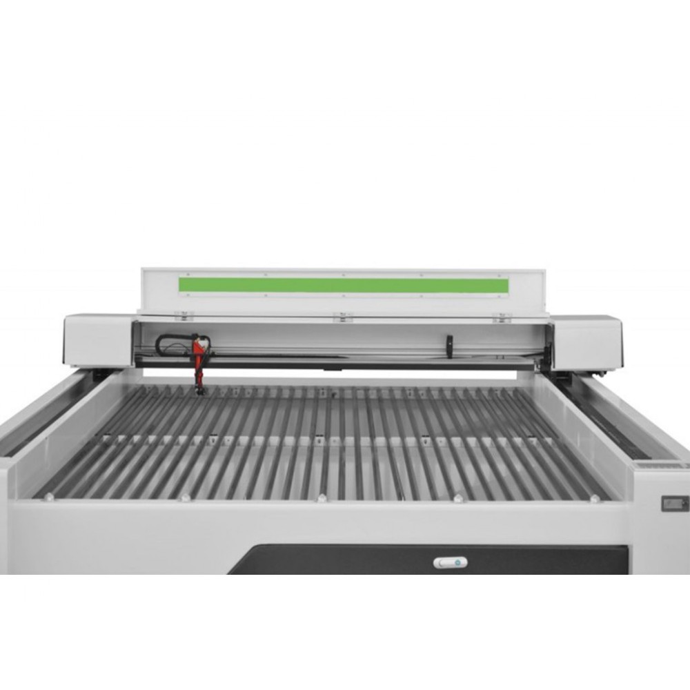Робоча область має розмір 1500х3000 мм. Професійний рідинний охолоджувач (чілер) підтримує оптимальну температуру лазерної трубки, потужний вентилятор ефективно видаляє вихлопні гази, а стільникова поверхня столу - відводить дим з робочої зони. Механізм червоної точки дозволяє точно позиціонувати лазерний промінь, а американські оптичні лінзи US II-VI від American Photonics забезпечують високу якість передачі променя. USB-інтерфейс і вбудована пам'ять (512 МБ) дозволяють передавати файли безпосередньо на верстат, без постійного підключення до комп’ютера. Цей лазерний верстат для різання і гравіювання сумісний з популярними графічними програмами CorelDraw, AutoCAD, Photoshop і підтримує широкий спектр вхідних форматів файлів, що суттєво збільшує його можливості.