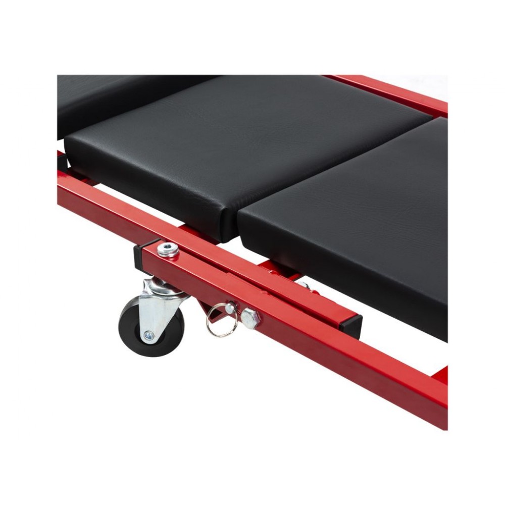 Сталева рама стійка до зношування і скручування, що гарантує надійність і тривалий термін служби. М’яка подушка з екошкіри забезпечує комфорт під час тривалої роботи. 6 обертових коліс на підшипниках дозволяють легке переміщення стільця-лежанки без необхідності вставати з нього. Вага близько 10 кг забезпечує легке транспортування обладнання. Такий трансформер стілець-лежак може використовуватися при різних роботах, що робить його універсальним і практичним.