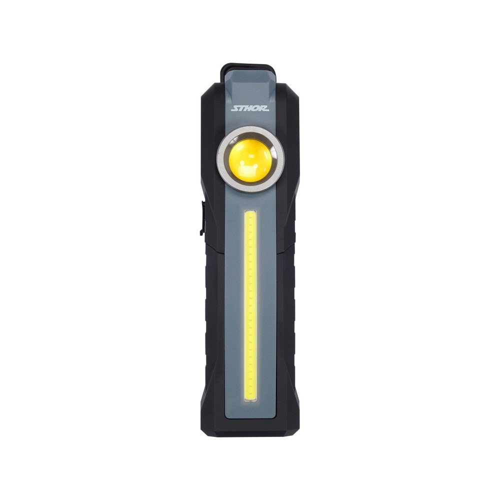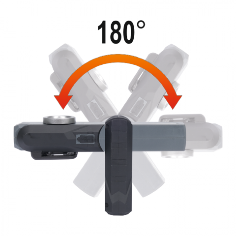 Факел майстерні з трьома джерелами світла. Його можна повісити на гачок або затискач. В основі розміщений магніт. Завдяки корпусу, що ламається, можна регулювати кут освітлення. Працює в послідовності: потужний світлодіодний ліхтарик - круглий COB LED - довгий COB LED.