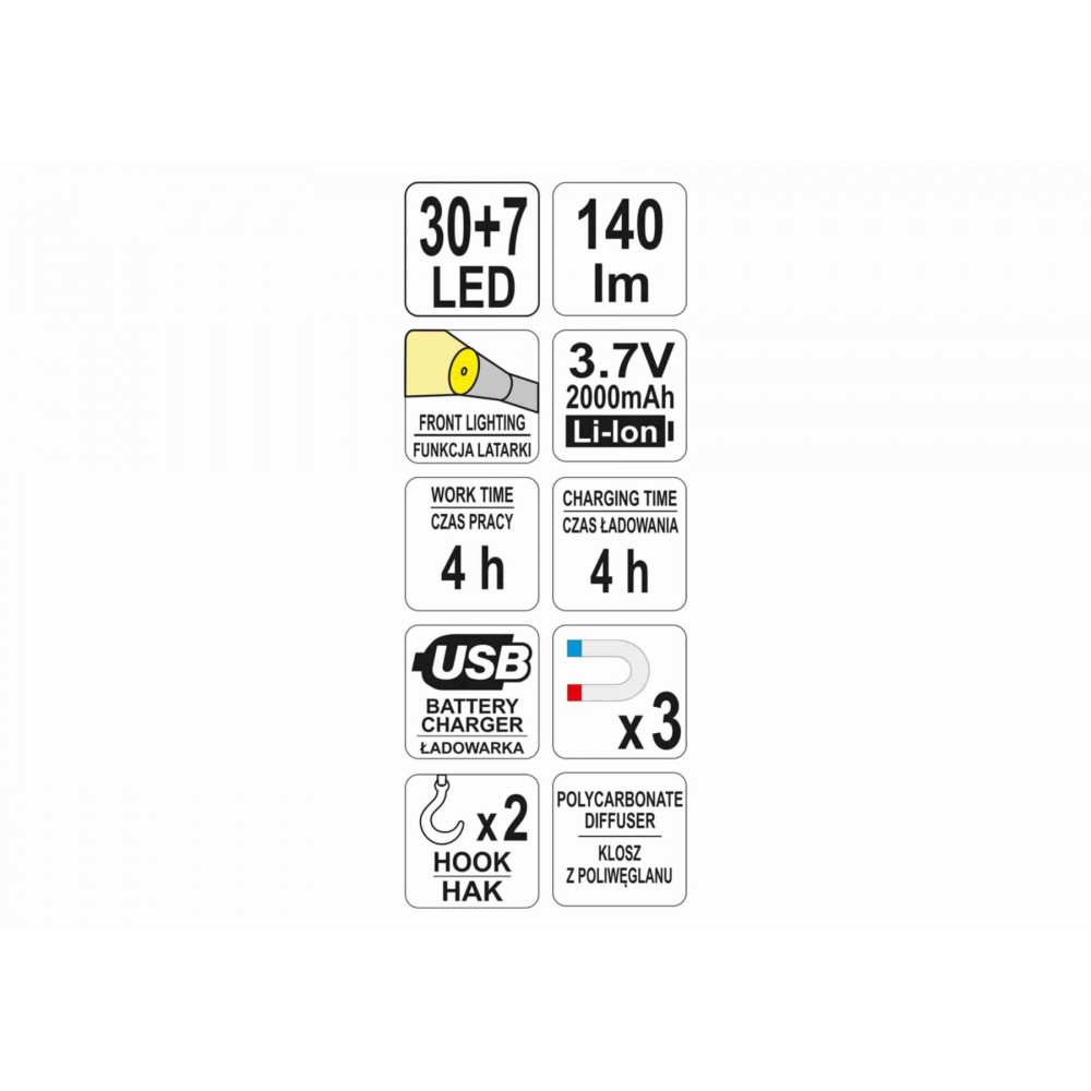 Ліхтар навісний світлодіодний акумуляторний YATO Li-Ion 3.7 В 2 Агод 30+7 LED 140 лм