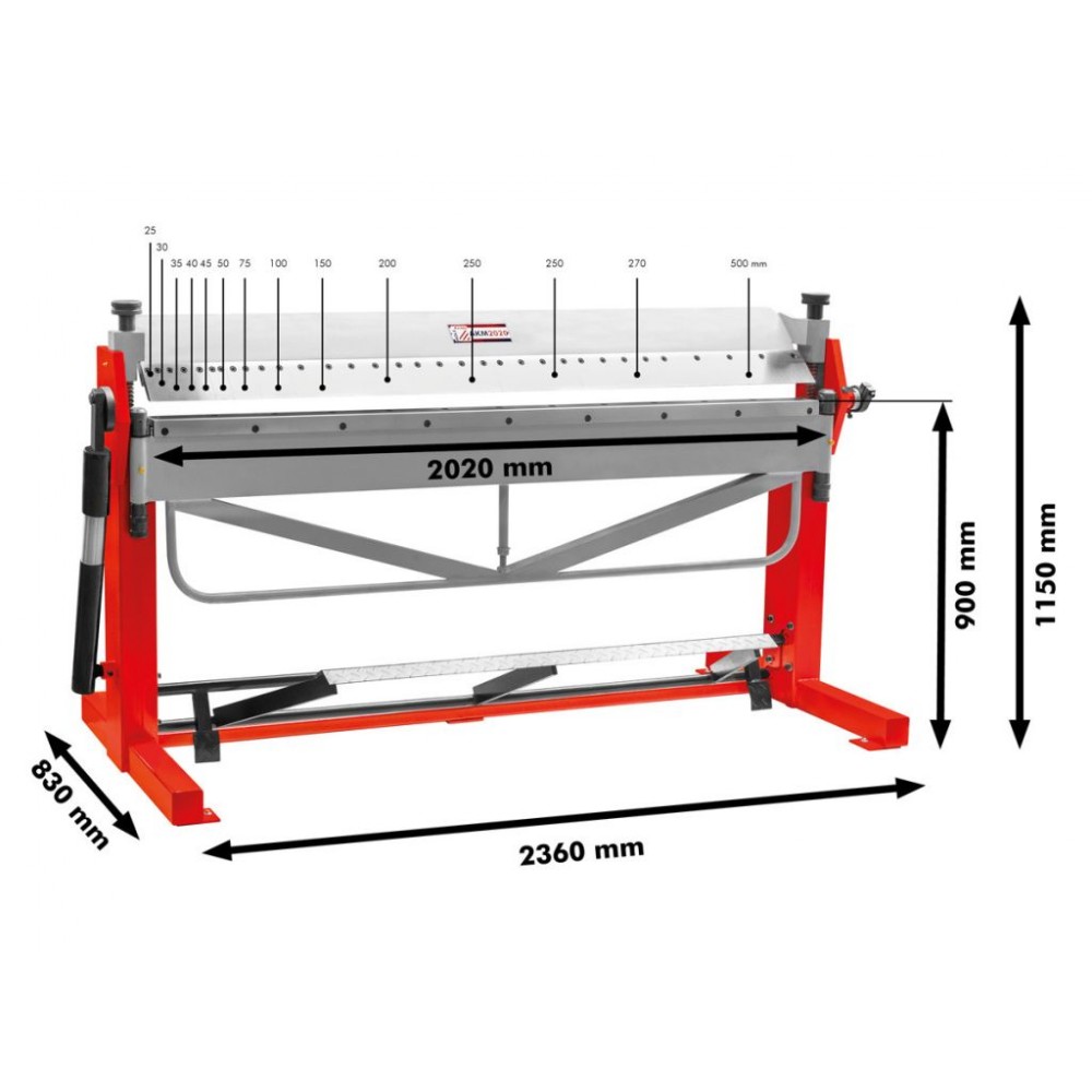 Листозгинальний верстат Holzmann AKM 2020 з робочою шириною 2020 мм призначений для згинання листового металу товщиною до 1,2 мм під кутом до 135°. Притискна балка з сегментами різних розмірів, що легко знімаються та переставляються, дозволяє виготовляти деталі зі складною геометрією та різноманітні конструкції. Підйом притискної балки здійснюється ножною педаллю. Максимальний зазор між балками становить 47 мм, регулювання зазору проводиться регулювальними гвинтами.