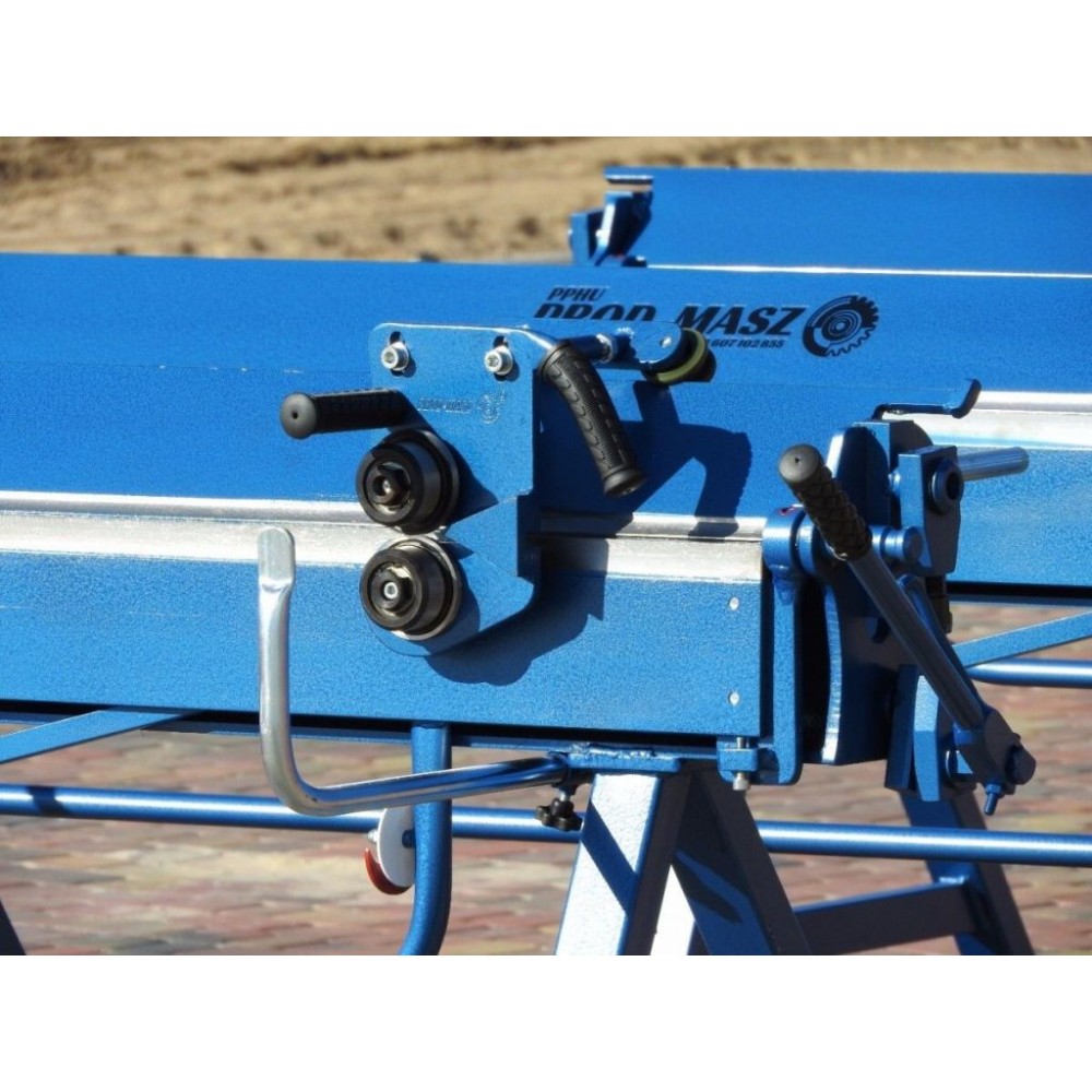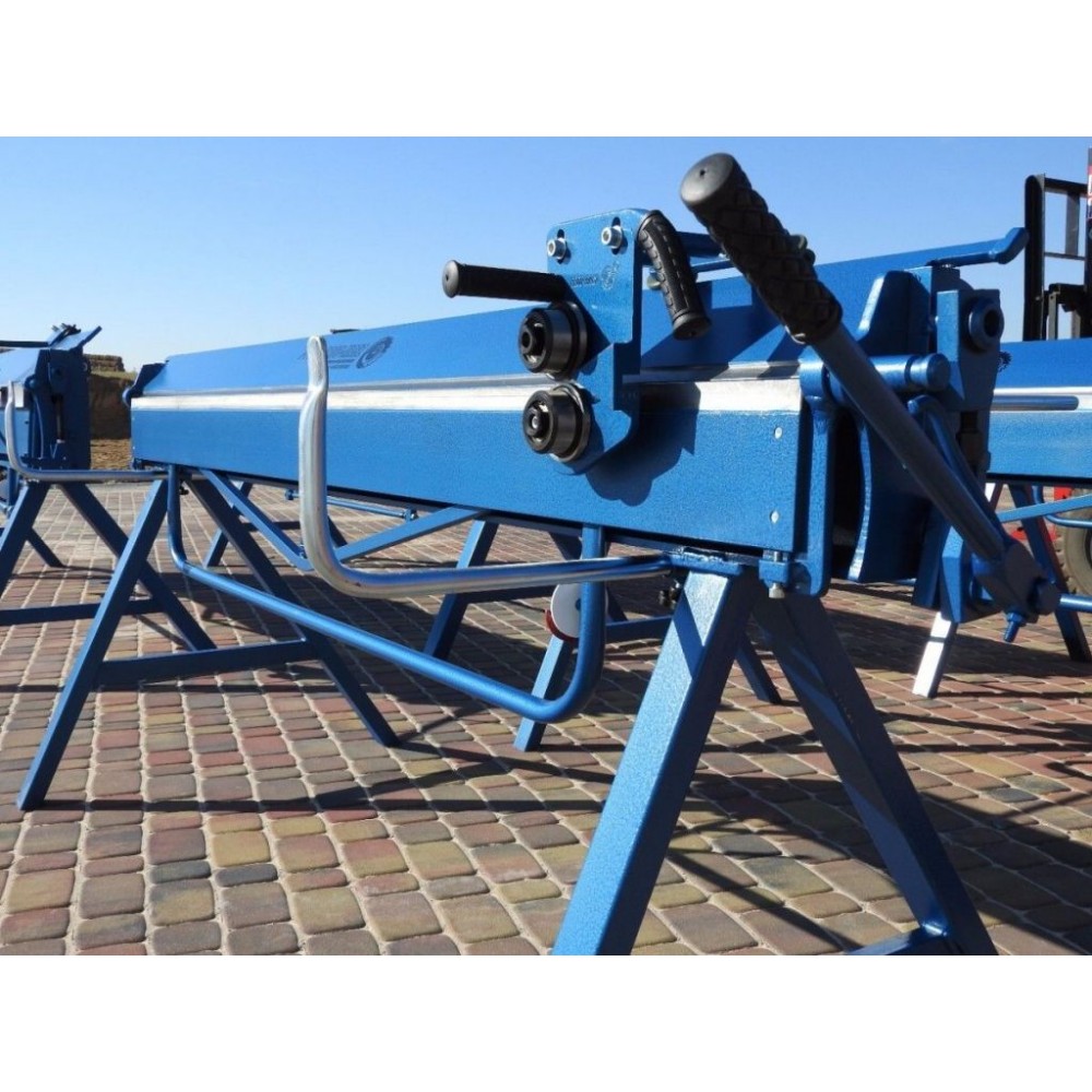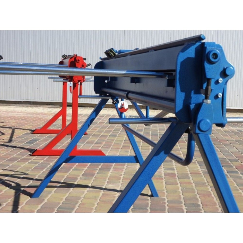 Згинальна і притискна балки виготовлені з високоякісного металу і мають високу стійкість до деформацій. Для точного виставлення кута згину верстат оснащений градусною шкалою. Для точного згинання заготовки під потрібним кутом є вбудований кутомір. У задній частині верстата є упори для підтримки листів. Глибина подачі заготовок необмежена. Опційно доступні до замовлення роликовий ніж і доварювальник, завдяки яким цей згинальний верстат для листового металу стане ще більш функціональним.