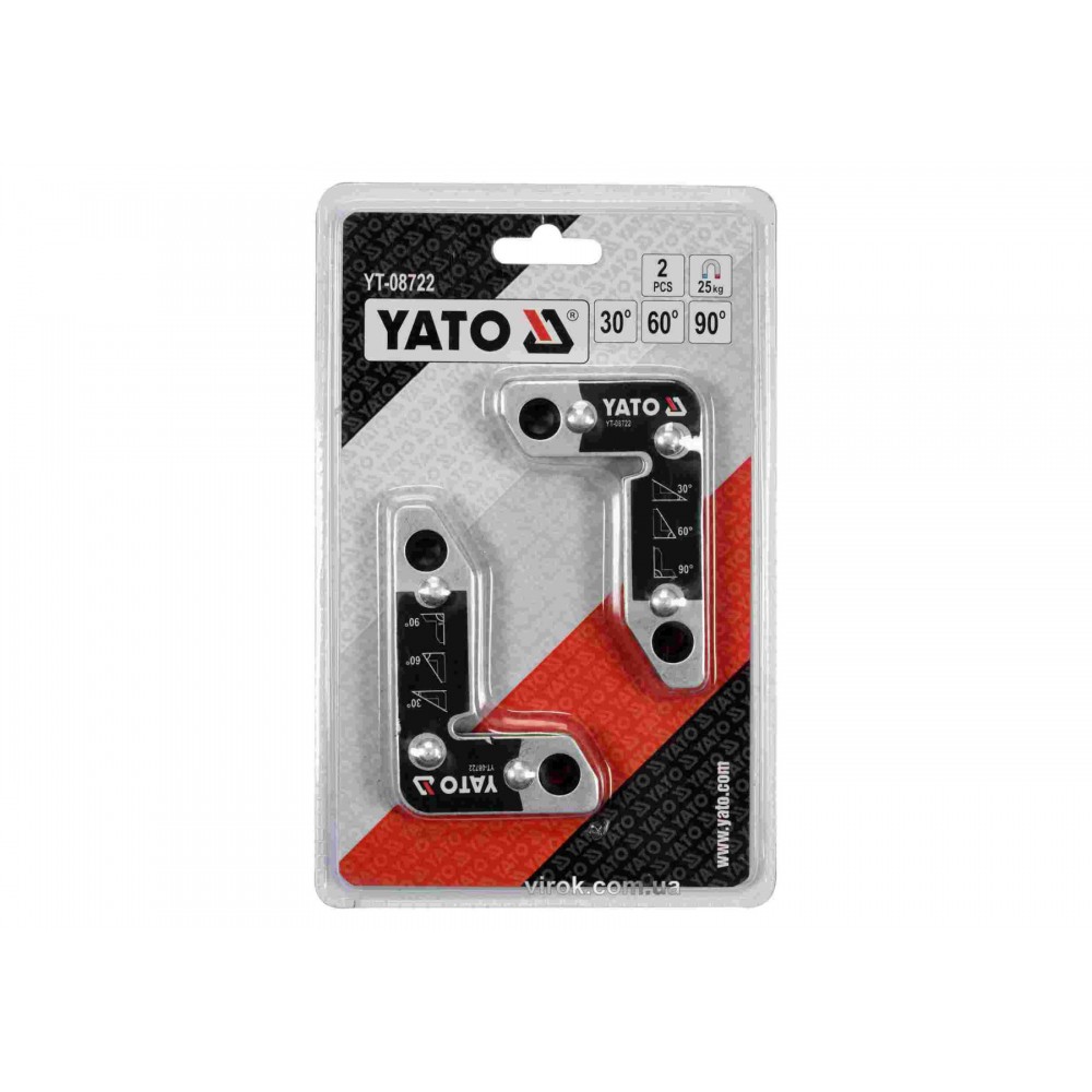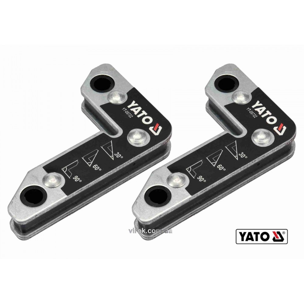 Набір із двох магнітних кутників YATO YT-08722, які застосовуються при зварюванні та монтажі для різних елементів: листів металу, з'єднувачів, плоских стержнів, профілів, труб і т.д. Вони забезпечують безпечне утримання зварювальних деталей завдяки сильним магнітам.