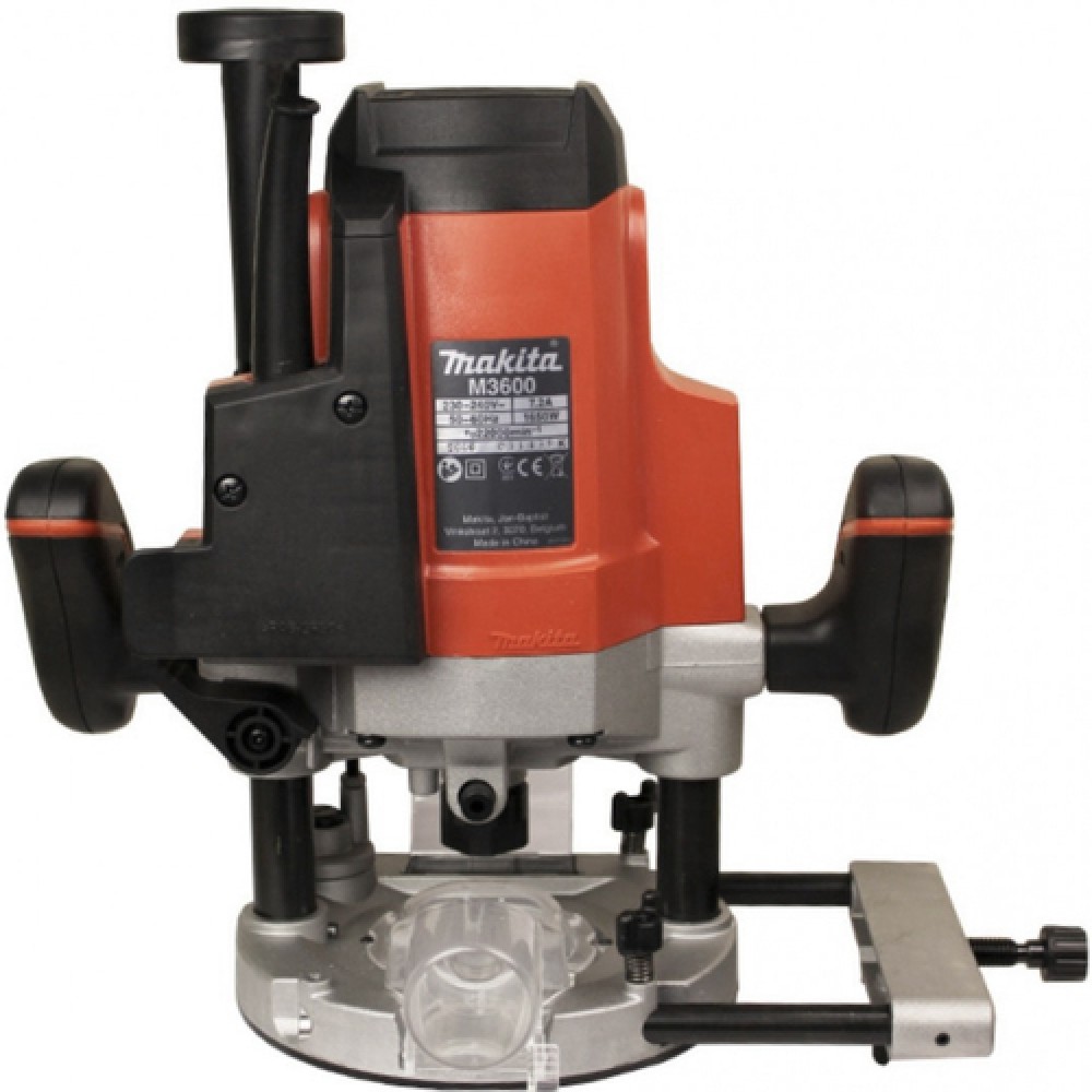 Фрезер Makita M3600: Патрубок для пилососа 415412-8 / Паралельний упор 342428-9 / Шаблон 16 345387-6 / Гайковий ключ 781034-9 / Цангова втулка 6 мм 7/8 Цанг 6 мм 763811-6 /8 -2 / Притискна гайка 763629-0 / Фреза пазова 12 мм 733236-3 / Картонна коробка