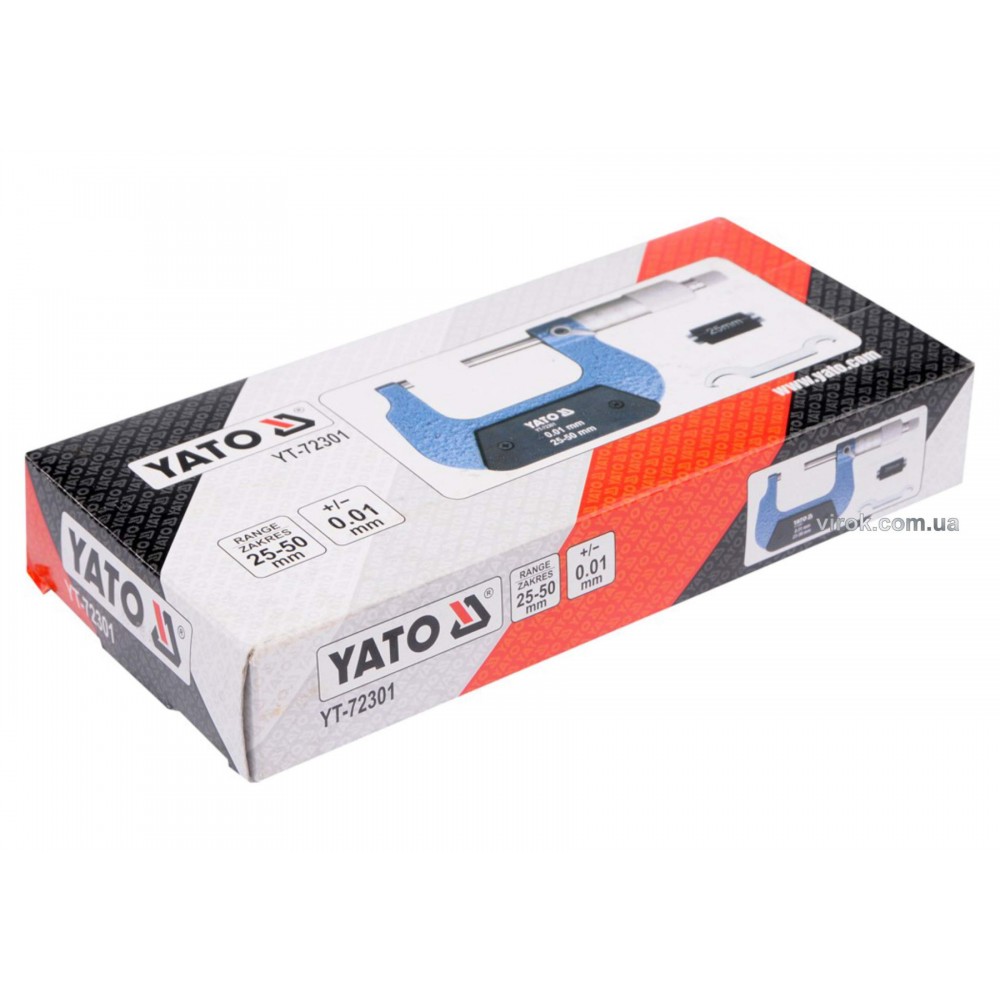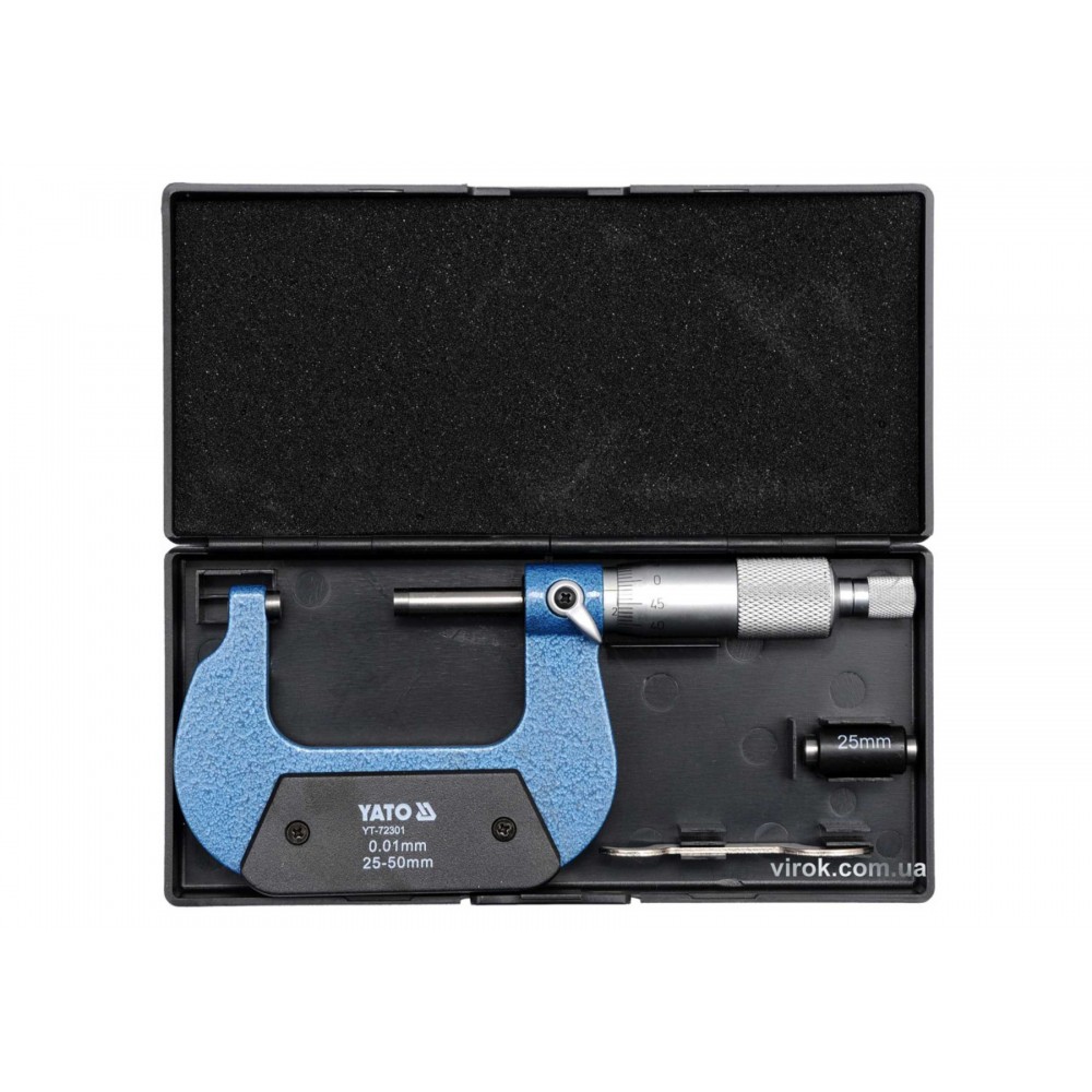 Мікрометр YATO YT-72301 — ручний інструмент, призначений для вимірювання лінійних розмірів деталей в області малих розмірів з високою точністю. Прилад має діапазон вимірювання від 25 до 50 мм, з ціною поділки в 0.01 мм.
