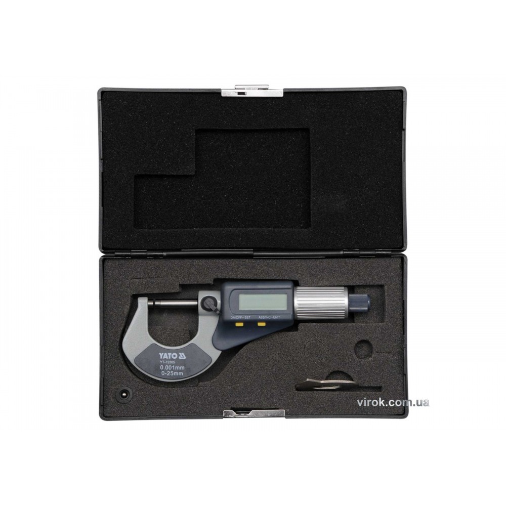 Цифровий мікрометр YATO YT-72305 — ручний інструмент, призначений для вимірювання лінійних розмірів деталей в області малих розмірів з високою точністю, оснащений РК-дисплеєм, на який виводяться значення. Прилад має діапазон вимірювання від 0 до 25 мм, з ціною поділки в 0.002 мм.