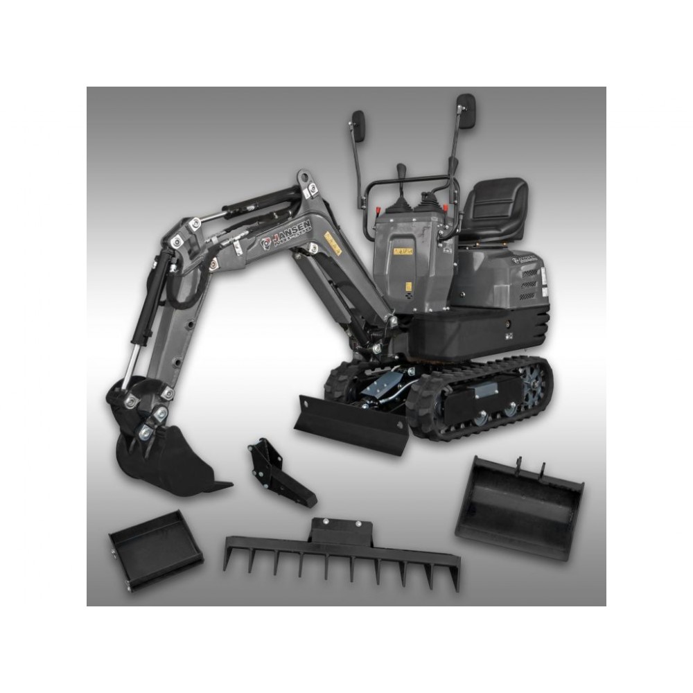 Крім того, у комплекті включені різні насадки, включаючи ківш екскаватора 30 см з додатковим "накриттям екскаватора", що розширює його функціональні можливості. Потужний гідронасосний агрегат забезпечує ефективну роботу, а гідравлічно опускається бульдозерний відвал робить роботу більш зручною.