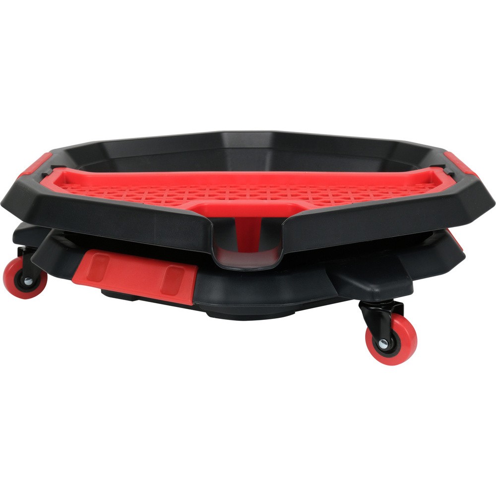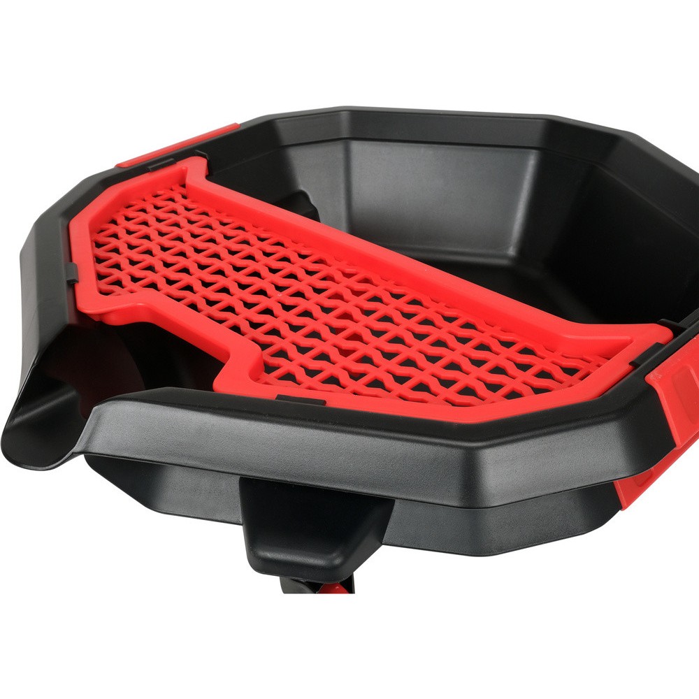 Піддон для заміни масла з додатковим лотком для приладдя та інструментів. Три коліщатка дозволяють швидко регулювати положення чаші. матеріал: ПП місткість: 8 л кількість коліс: 3 діаметр колеса: 50 міліметрів розмір: 470х137 мм