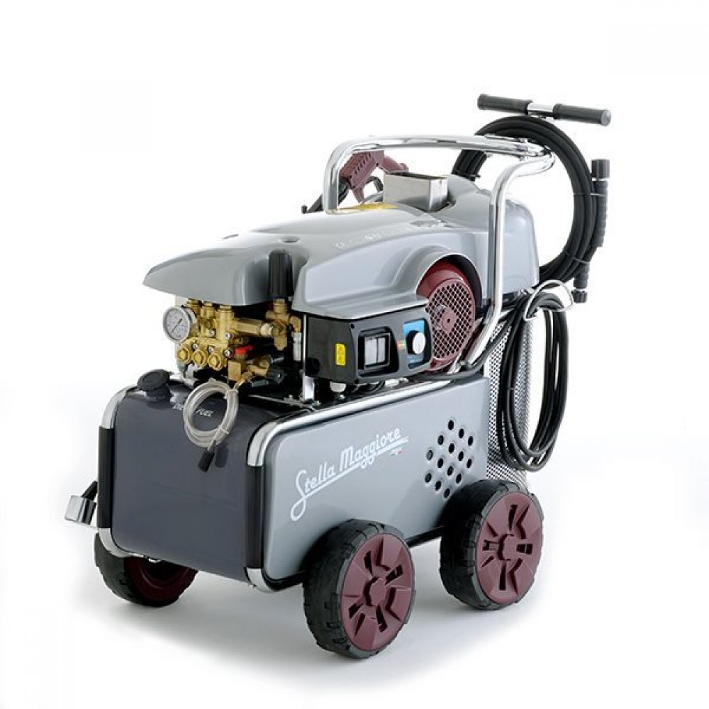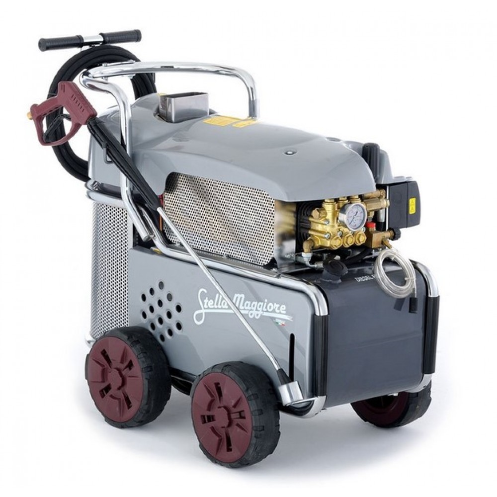 Мийка високого тиску Idrobase Stella Maggiore - промисловий мийний апарат для активного використання у сфері технічного обслуговування, на виробництві, в роботі комунальних служб і клінінгових компаній. Мийка працює з нагріванням води до 80°С. Дана модель ідеально підходить для безперервної експлуатації в важких умовах, завдяки наявності пасової передачі, що гарантує довгий термін служби і надійність.