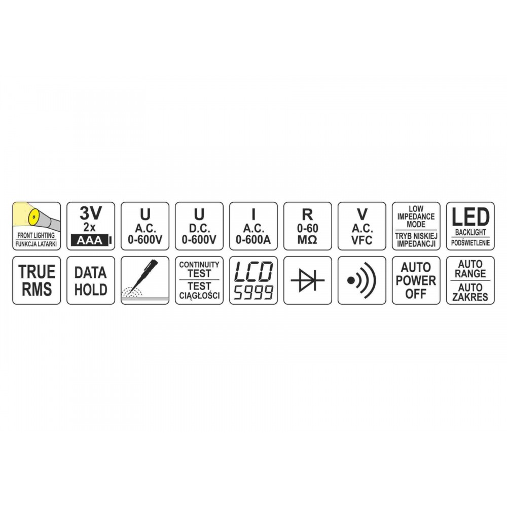 Мультиметр YATO YT-73092 оснащений вимірювальними кліщами, які дозволяють виміряти силу змінного струму в одиночному проводі індукційним методом. Це дозволяє вимірювати більш високий струм, чим звичайними електричними вимірювачами. Також можна вимірювати напругу постійного та змінного струму, опору, а також контролювати працездатність світлодіодів. Це корисно для виявлення несправних компонентів електрообладнання.