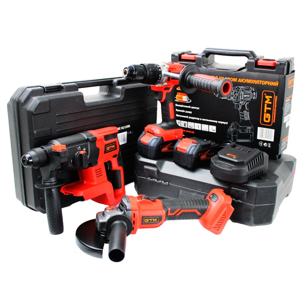 Характеристики Набір акумуляторного інструменту GTM 18V шурупокрут DSI18/80BL, болгарка AGC18/125BL, перфоратор RHC18/22BL + 2 АКБ і ЗП (PROMO_3)