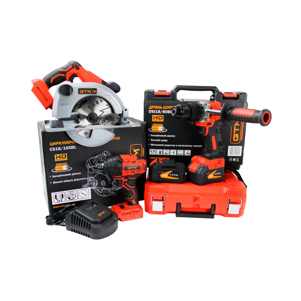 Опис Набір акумуляторного інструменту GTM 18V шурупокрут DSI18/80BL, дискова пила CS18/165BL, гайкокрут IWC18/320BL + 2 АКБ і ЗП (PROMO_2)