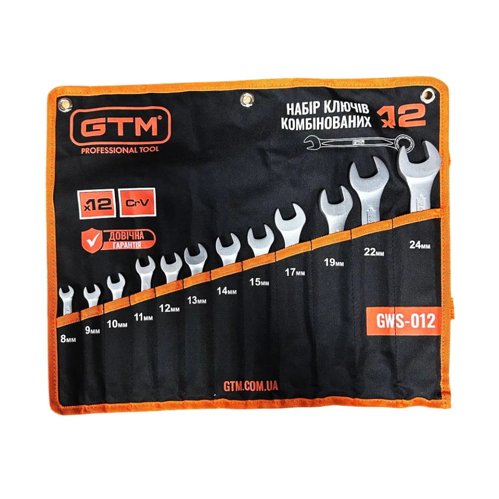 GTM GWS-012 - набір комбінованих гайкових ключів для закручування/викручування болтів, гайок та інших різьбових з'єднань. Даний набір поставляється в зручному тканинному чохлі, який дозволяє компактно зберігати їх як в багажнику автомобіля, так і на полиці в майстерні. Даний набір призначений для професійного застосування, але підійде також для роботи в побуті..