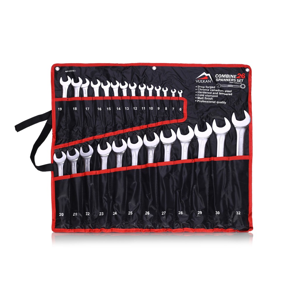 Набір гайкових ключів Vulkan 6-32 мм складається з 26 комбінованих гайкових ключів для закручування / викручування болтів, гайок і інших різьбових з'єднань. Даний набір поставляється в зручному чохлі з тканини, який дозволяє компактно зберігати їх як в багажнику автомобіля, так і на полиці в майстерні.