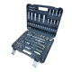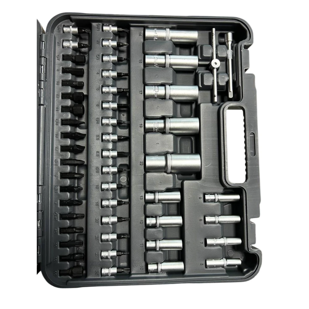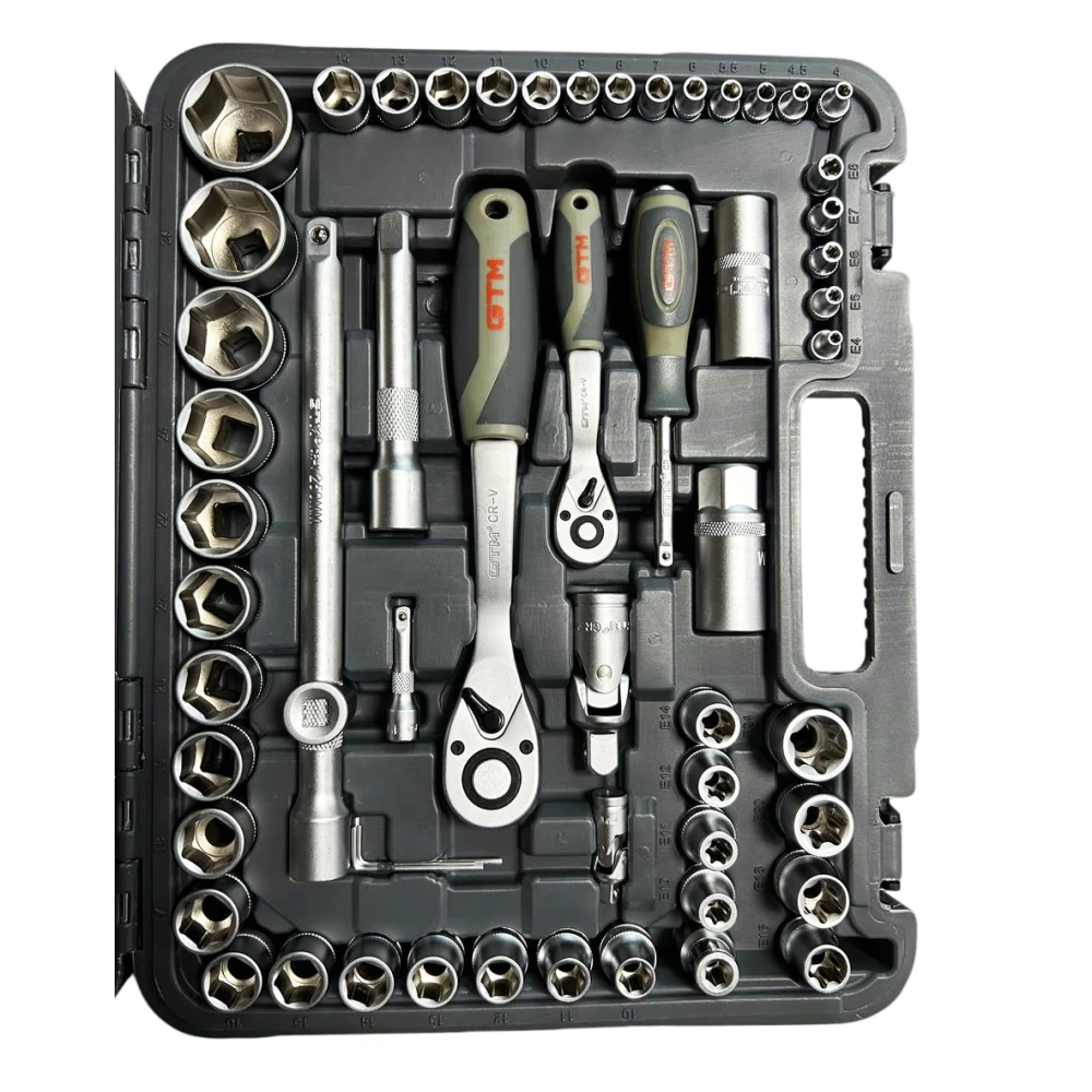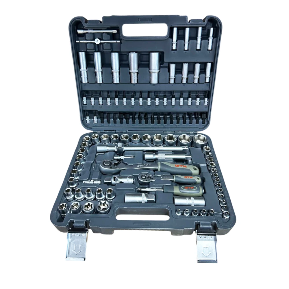 GTM GTS-108 - універсальний набір інструментів, призначений для використання вдома, в майстернях і СТО. Всі інструменти виготовлені з високоякісного сплаву хромо-ванадієвої сталі. Завдяки цьому набір не боїться корозії і впливу вологи. Включає в себеторцеві головки 1/4" та 1/2", тріскачки, воротки і перехідники. Поставляється у фірмовому ударостійкому захисному кейсі GTM.