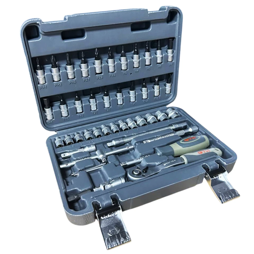 GTM GTS-046 - універсальний набір інструментів, призначений для використання вдома, в майстернях і СТО. Всі інструменти виготовлені з високоякісного сплаву хромо-ванадієвої сталі. Завдяки цьому набір не боїться корозії і впливу вологи. Включає в себе торцеві головки 1/4", тріскачку, шестигранні ключі, воротки і перехідники. Поставляється у фірмовому ударостійкому захисному кейсі GTM.