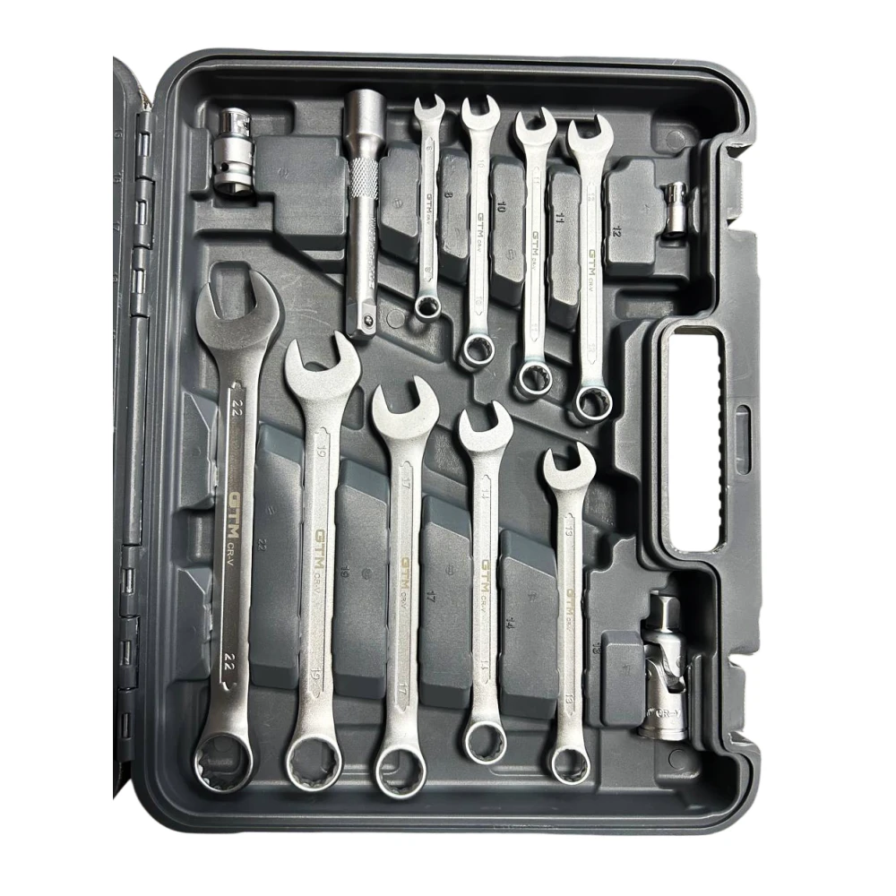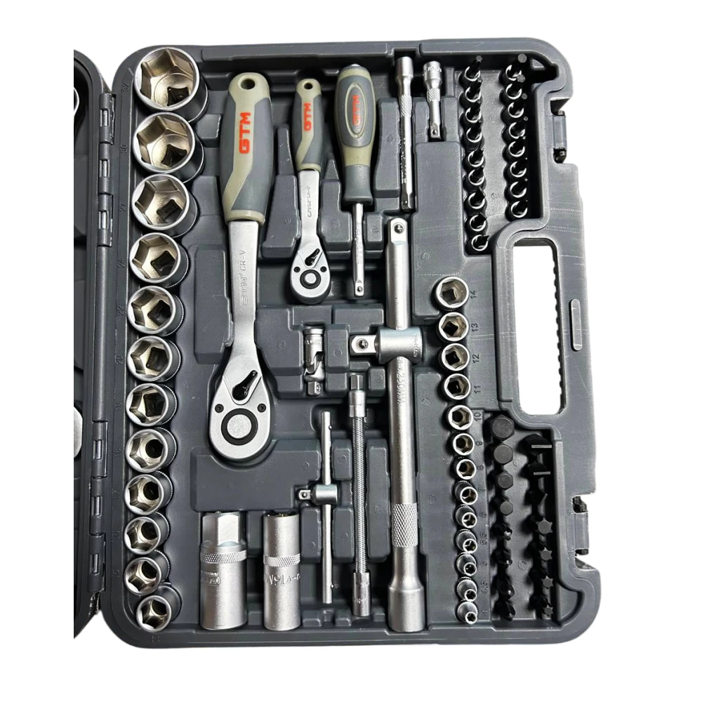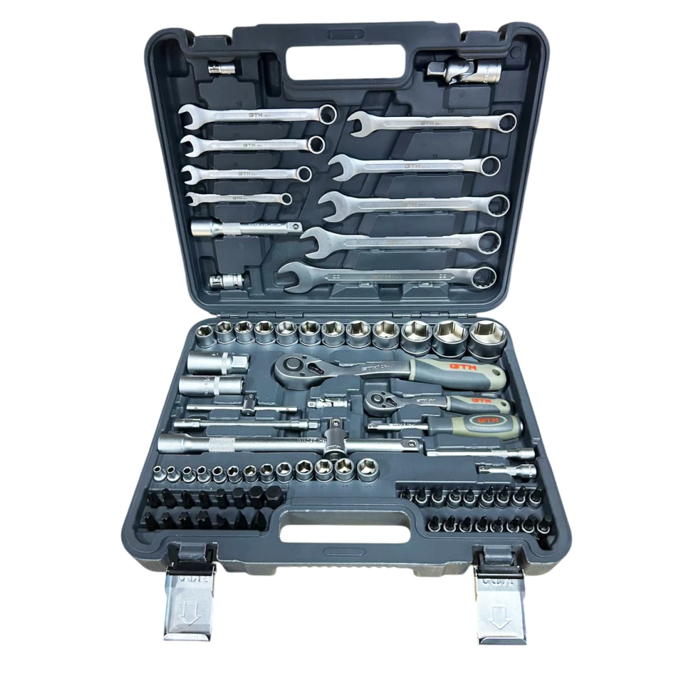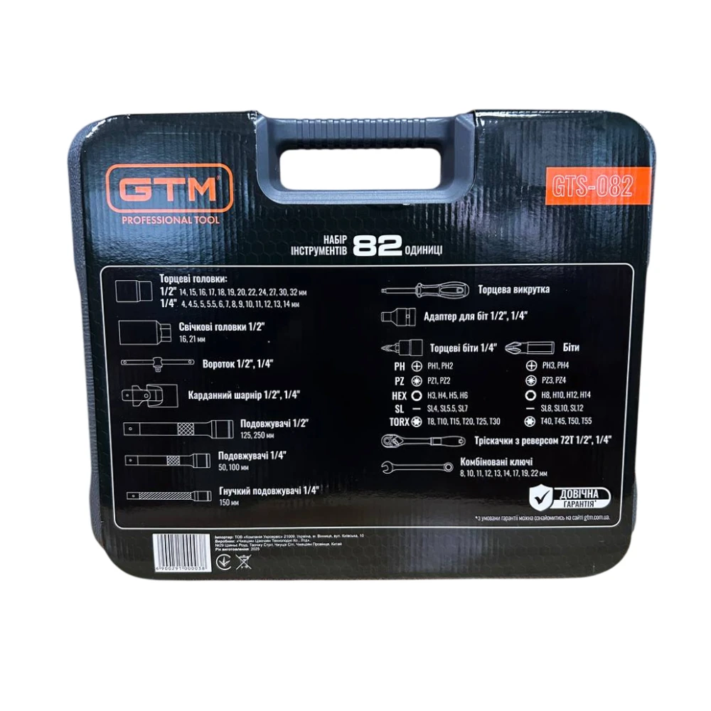 GTM GTS-082 - універсальний набір інструментів, призначений для використання вдома, в майстернях і СТО. Всі інструменти виготовлені з високоякісного сплаву хромо-ванадієвої сталі. Завдяки цьому набір не боїться корозії і впливу вологи. Включає в себе комбіновані ключі, торцеві головки 1/4" та 1/2", тріскачки, воротки і перехідники. Поставляється у фірмовому ударостійкому захисному кейсі GTM.