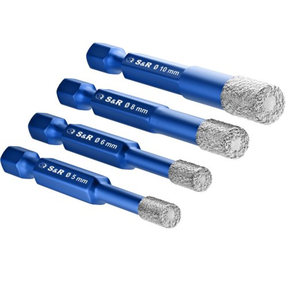 Набір алмазних свердл по склу і кераміці S&R Hex 1/4" 4 шт - інструмент для свердління точних і акуратних отворів у таких крихких матеріалах, як керамічна плитка, скло, скловолокно, керамограніт, кварц, мармур.