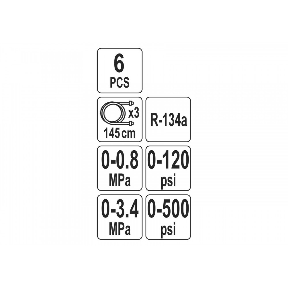 - В комплекті: 2-клапанний блок із оглядовим склом і манометром низького та високого тиску, два з'єднання для кондиціонування повітря низького та високого тиску і три резинові трубки довжиною 145 см