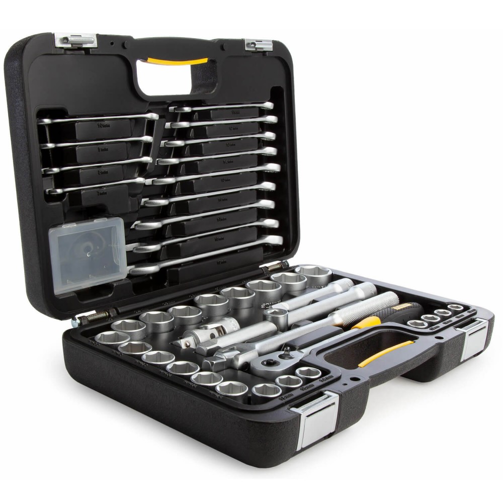 Склад набору: Головки торцеві 1/2″ 6-гранні (21 шт.): 10-11-12-13-14-15-16-17-18-19-20-21-22-23-24-25-26-27 -28-30-32 ммРукоятка з храповим механізмом 1/2″Подовжувачі 1/2″: 125, 250 мм (з інтегрованим адаптером 1/2″ M - 3/8 ″F мм)Рукоятка з шарніром 1/2″.Шарнір карданний 1/2″Ключі комбіновані ″FatMax″ (13 шт.): 7-8-9-10-11-12-13-14-15-16-17-18-19 мм
