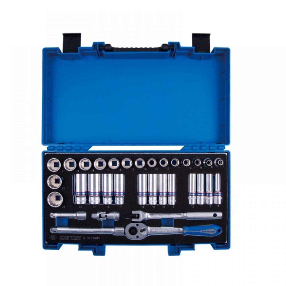 Набір торцевих головок та ключів KING TONY 3/8"DR 7-24 мм, 33 предмети (3033MRV) особливості: Застосовуються для закручування та відкручування гайок та болтів із дванадцятигранною головкою Виготовлені з хромованадієвої сталі Покриті хромом, який захищає інструменти від корозії. Висока якість матеріалів Тривалий термін служби Комплектація: Торцеві головки 12PT 7, 8, 9, 10, 11, 12, 13, 14, 15, 16, 17, 18, 19, 21, 22, 24 мм Торцеві головки подовжені 12PT 8, 10, 11, 12, 13, 14, 15, 16, 17, 19, 21, 22 мм Подовжувачі 75, 150 мм Вороток із шарніром 200 мм Тріскачка, 32 зубці, 200 мм Кардан Поставляється у пластиковому кейсі Ціна вказана на набір 33 штуки. Даний товар відпускається лише кількістю кратного набору