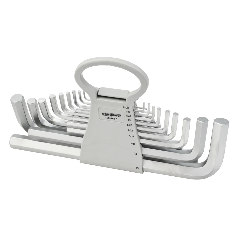 Whirlpower 158-2317 - набір, що складається з 17 Г-подібних подовжених дюймових ключів для закручування/викручування болтів із шестигранними шліцами типу Hex. Такий тип наконечників дозволяє досягти більш високого моменту, що крутить, ніж при використанні плоских або хрестоподібних шліців.