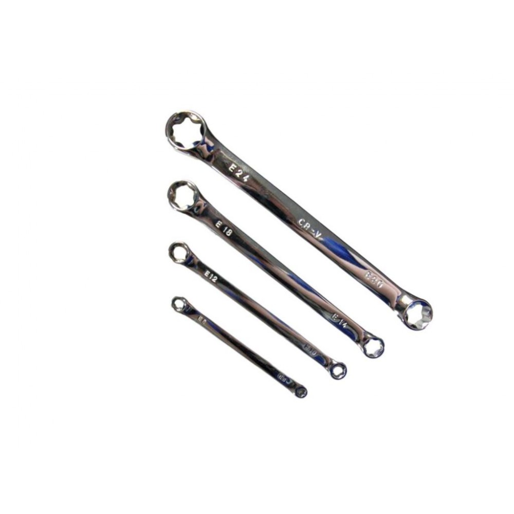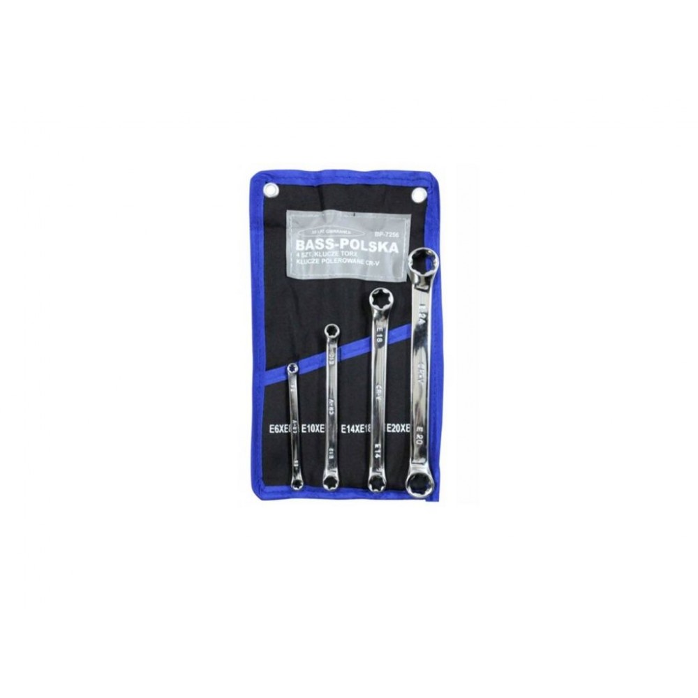 Набір накидних ключів Bass Polska BP-7256 - складається з чотирьох ключів, виготовлених з хромованадієвої сталі, що забезпечує тривалий термін служби та надійність. Сатиноване покриття ключів допомагає запобігти зісковзуванню. Ці міцні ключі Torx забезпечують кращу передачу моменту, ніж шестигранні ключі. Весь набір зручно розміщено у футлярі з номерами ключів та отворами для підвішування на стіну. Технічні характеристики включають такі розміри ключів Torx: E6 x E8, E10 x E12, E14 x E18, E20 x E24, при довжині від 115 мм до 120 мм, виготовлені зі сталі CrV.
