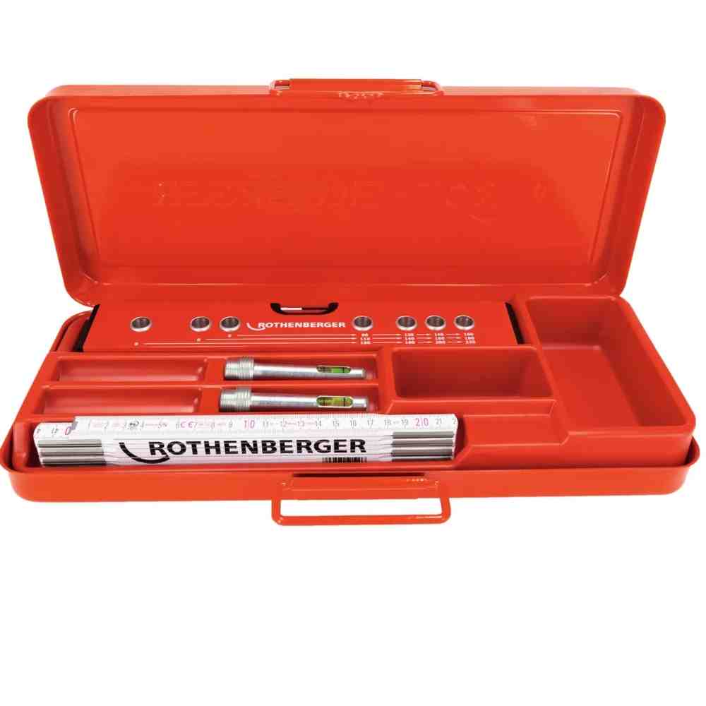 Рівень для кутових вентилів 200 мм (2 шт.).Рівень лінійка 300 мм (1 шт).Складана лінійка 2 м-код (1 шт).Сталева валіза (1 шт).