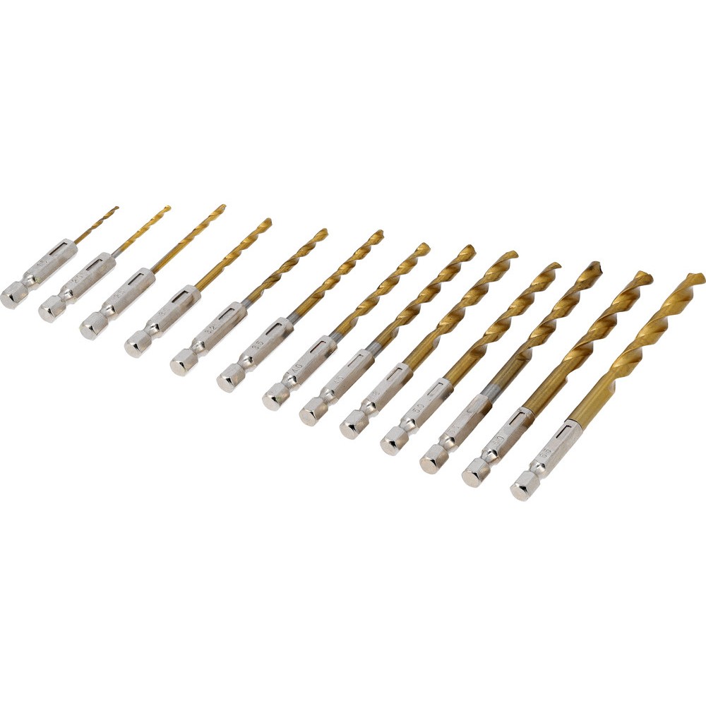 Набір із 13 свердел по металу, виготовлених зі швидкорізальної сталі HSS, що робить свердла надзвичайно міцними, довговічними та стійкими до зносу, що дозволяє працювати на високих швидкостях.