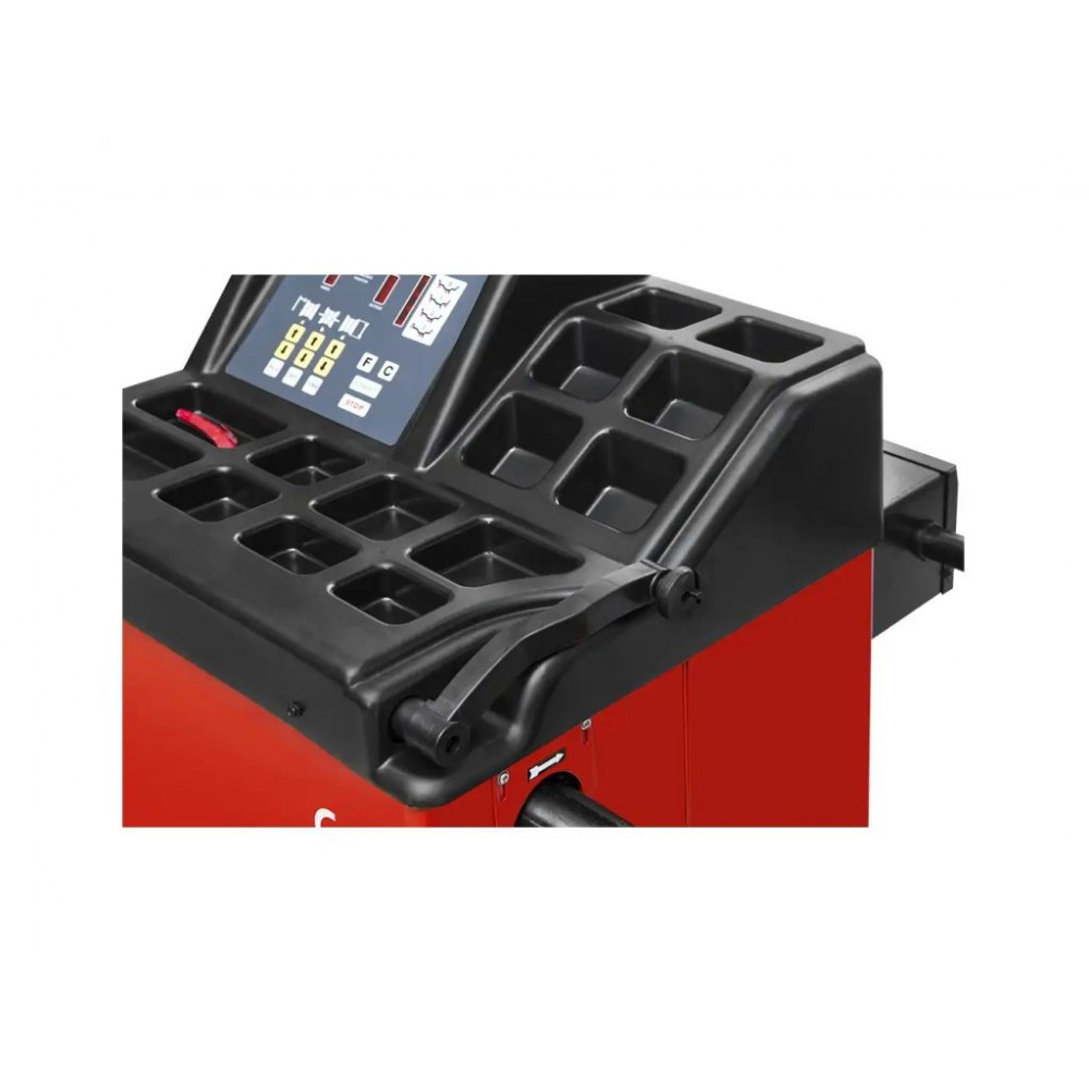 Введення даних обода здійснюється через інтуїтивно зрозуміле меню з мінімальною кількістю кнопок, що робить процес максимально простим. Ручне зчитування параметрів гарантує 100% надійність. Завдяки великим полицям для балансувальних вантажів і конусним вішалкам пристрій відрізняється високою ергономічністю.