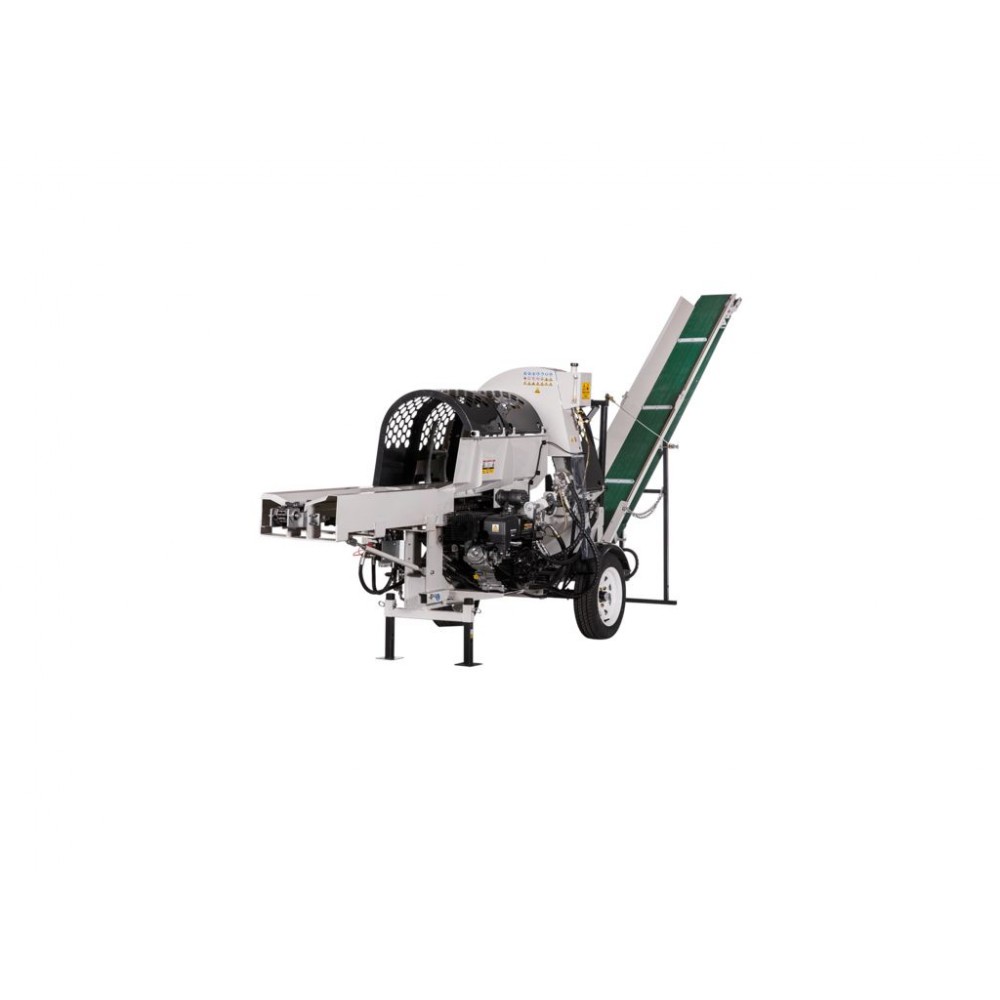 Гідравлічна ланцюгова пилка і тримач колоди забезпечують швидку та легку роботу. Інтегрований гідравлічний транспортер автоматично подає матеріал до машини для розколювання. З продуктивністю 5-8 м³ деревини на годину і автоматичним видаленням матеріалу за допомогою стрічкового конвеєра, ця розколювальна машина ідеально підходить для ефективної обробки деревини.