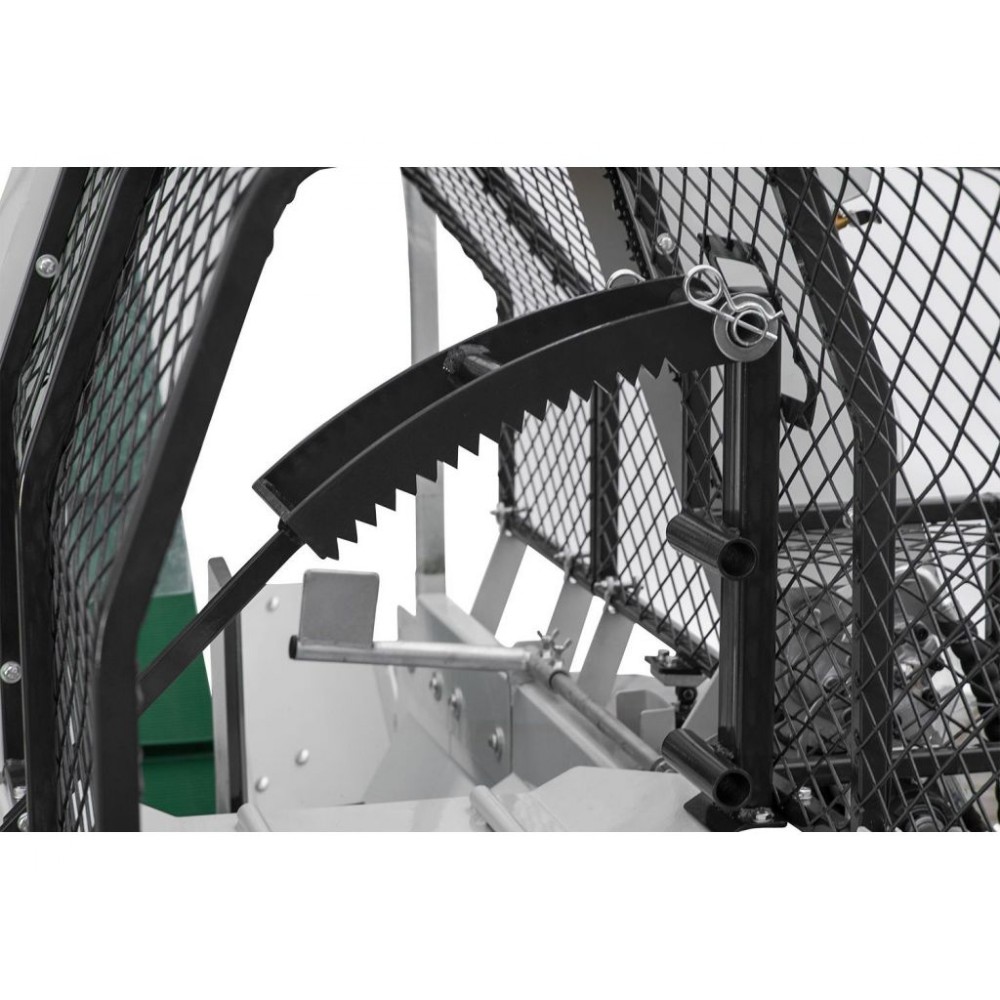 Гідравлічна ланцюгова пила розпилює колоду по всій довжині, а гідравлічний хрестоподібний клин розколює її на 4 частини. Подача колоди до ріжучого блока і вивантаження дров здійснюються автоматично, за допомогою гідравлічного стрічкового конвеєра довжиною 3,2 м. Для захисту від вильоту стружки і випадіння колод є захисна огорожа, а для переміщення обладнання - 2 великих колеса і фаркоп. Потужний функціонал і надійна конструкція дозволяють успішно використовувати цей напівавтоматичний дроворіз для бізнесу (комунальні підприємства, підприємства по заготівлі дров тощо), а також у великих приватних господарствах.