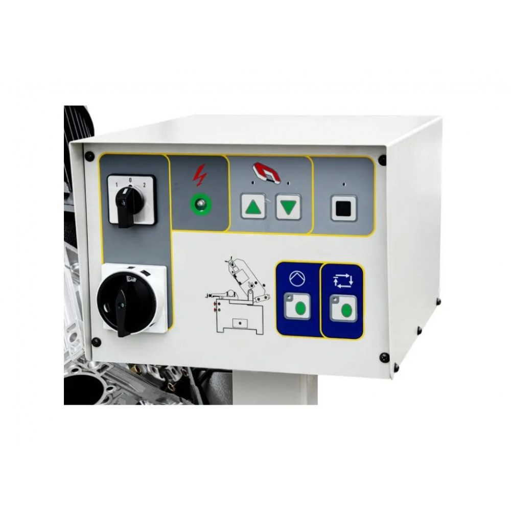 Машина оснащена ефективним насосом охолодження з замкнутим контуром, а привод передається через зубчасту передачу. Трифазний двигун має дві швидкості різання і термозахист. Додатково, пила обладнана годинниковим тензометром для контролю натягу стрічки та автоматичним вимикачем при обриві.