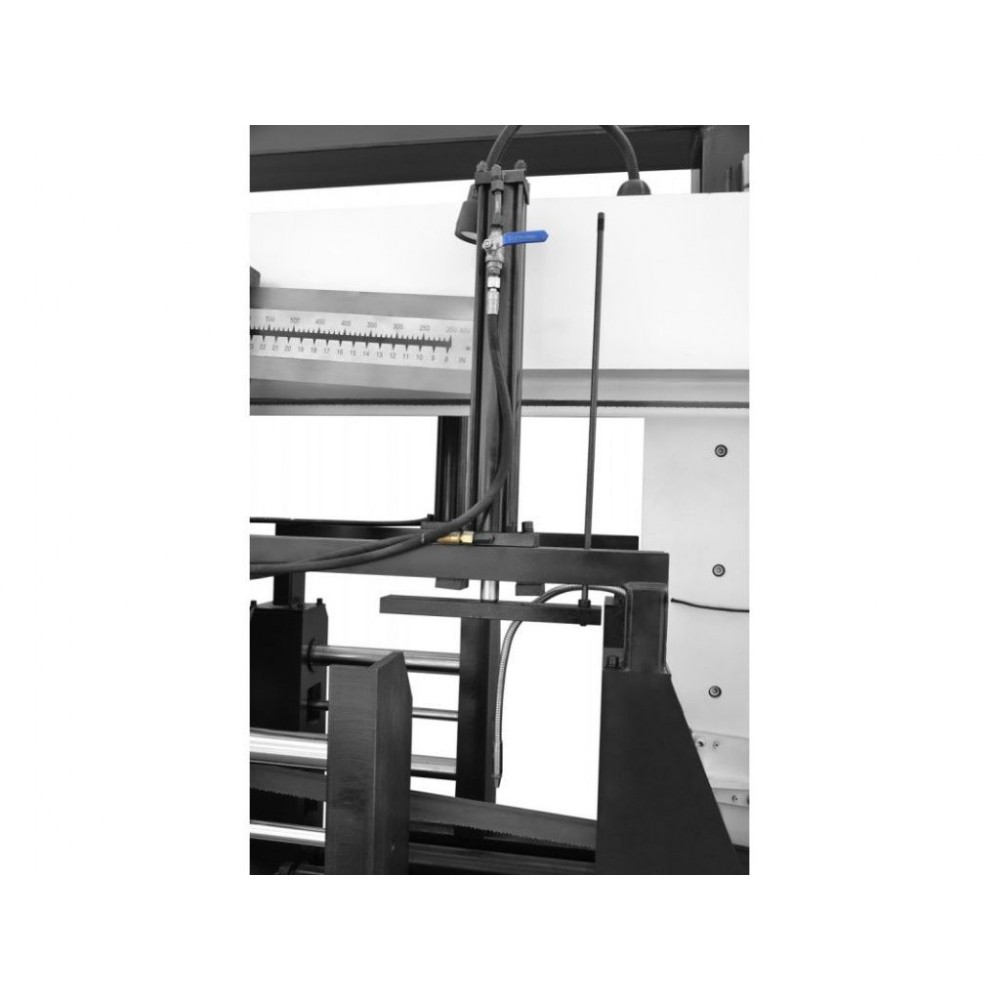 На стрічково-пильному верстаті встановлені подвійні лещата, одні використовуються для затискання при розпилюванні, другі для подачі заготовки на заданий розмір. Довжина подачі контролюється ультрафіолетовим датчиком руху, який контролює нульову точку та величину переміщення заготовки.