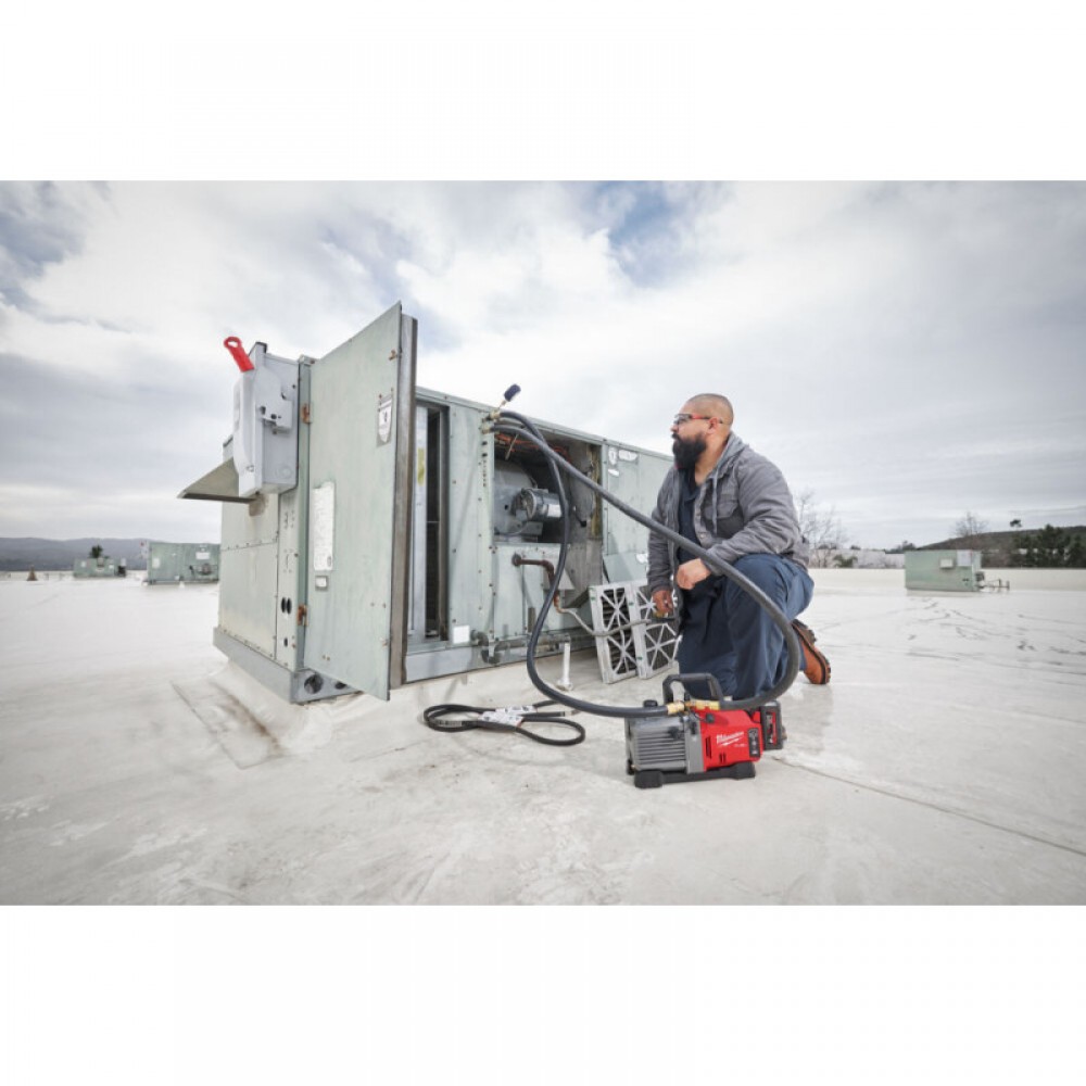 Двоступінчастий акумуляторний вакуумний насос всмоктує частинки до 25 мікронів зі швидкістю потоку 142 л/хв. Впускні отвіри (порти) 1/2'', 3/8'' та 1/4''.