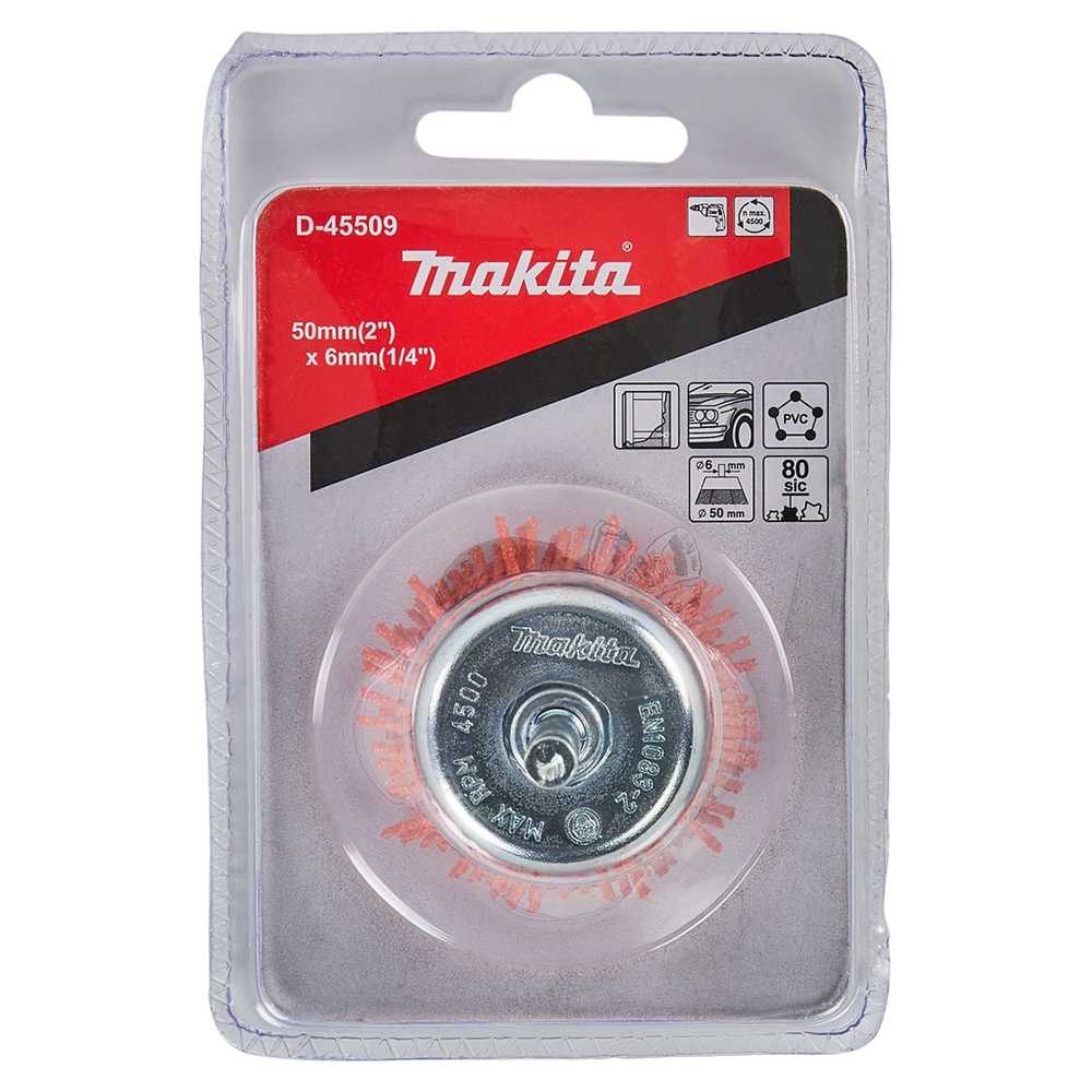 Нейлонова чашкова щітка Makita D-45509 оснащена стандартним хвостовиком 6 мм, що забезпечує її сумісність з більшістю дрилів, шуруповертів та прямих шліфувальних машин. Це робить її універсальним та зручним аксесуаром для будь-якої майстерні. Максимальна кількість обертів 4500 об/хв гарантує безпечну та ефективну роботу на оптимальних швидкостях, дозволяючи досягати бажаного результату без ризику перегріву інструменту або пошкодження щітки. Діаметр щітки 50 мм є оптимальним для точних робіт та доступу до складних ділянок. Жорстка нейлонова щетина, поєднана з абразивними частинками грануляції 80, забезпечує високий рівень зняття матеріалу, при цьому мінімізуючи забивання та забезпечуючи стабільну продуктивність.