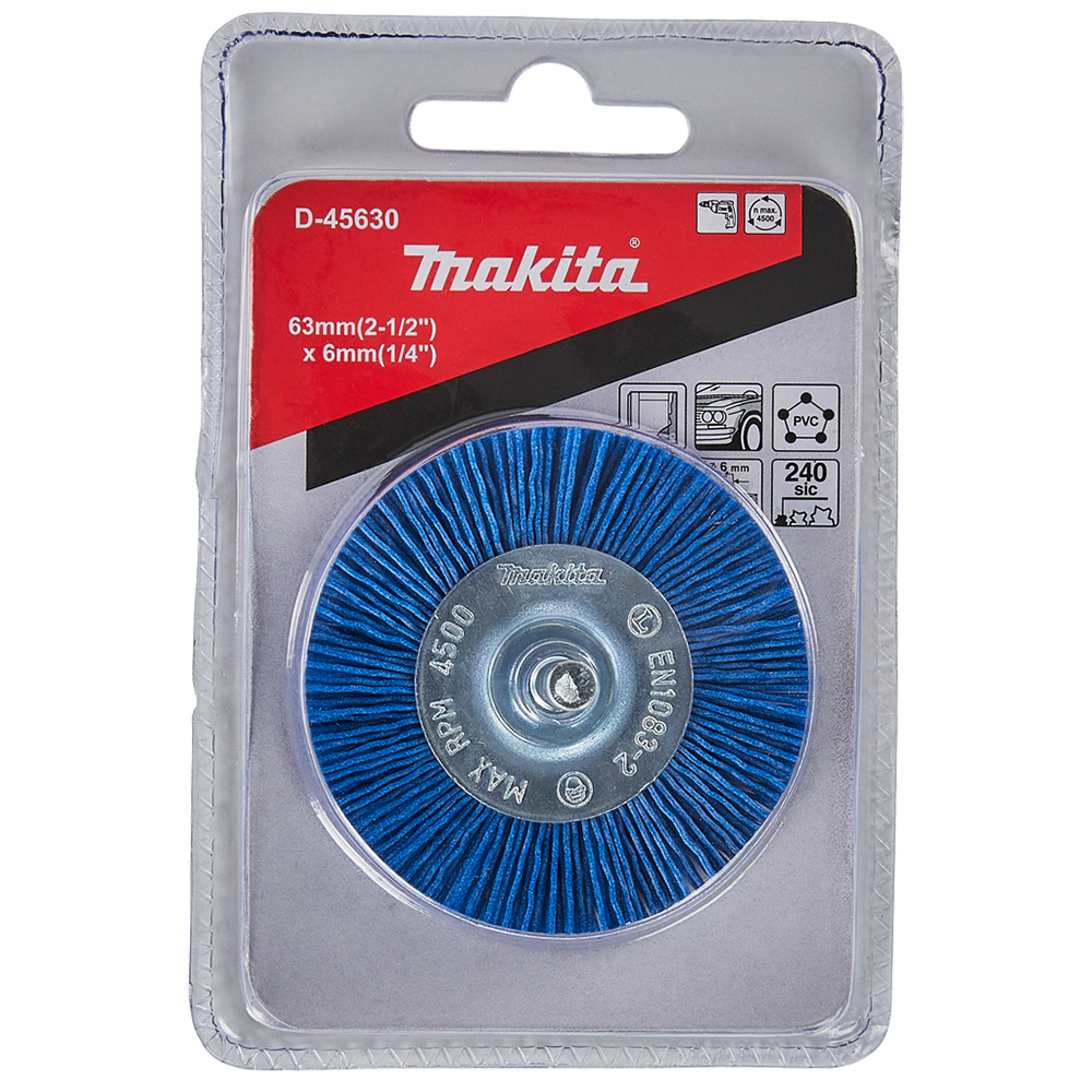 Щітка оснащена хвостовиком діаметром 6 мм, що робить її сумісною з більшістю стандартних дрилів, шуруповертів, прямих шліфувальних машин та інших обертових інструментів. Це забезпечує легкість встановлення та надійну фіксацію. Щітка Makita D-45630 розрахована на максимальну кількість обертів до 4500 об/хв. Цей діапазон обертів є оптимальним для нейлонових щіток, дозволяючи ефективно полірувати та очищати без ризику перегріву або пошкодження матеріалу. Діаметр щітки 63 мм забезпечує достатню площу контакту для швидкої роботи, зберігаючи при цьому маневреність завдяки конічній формі.