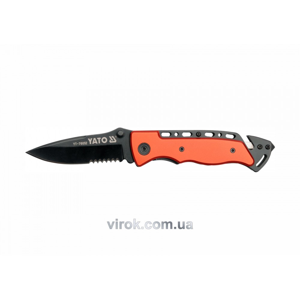 Складний ніж YATO з чорним лезом 'drop point', довжиною 95 мм, лезо з частин, зовні пряме, зсередини зубчасте, збільшує діапазон використання ножа, можливість відкриття однією рукою,