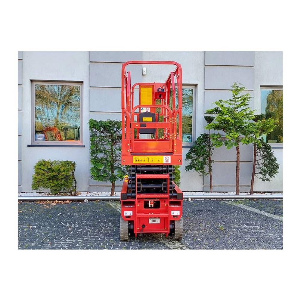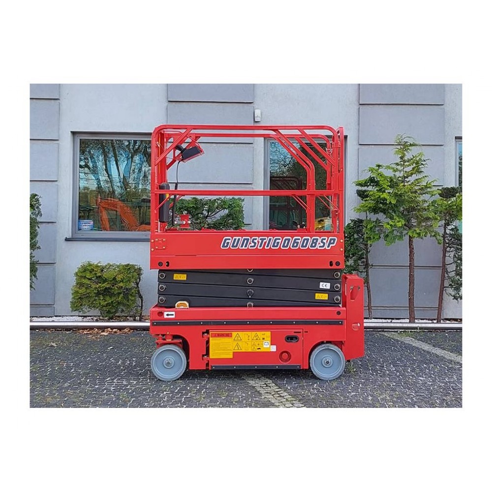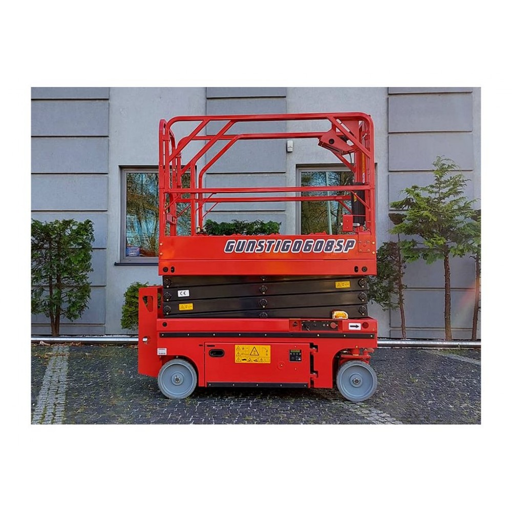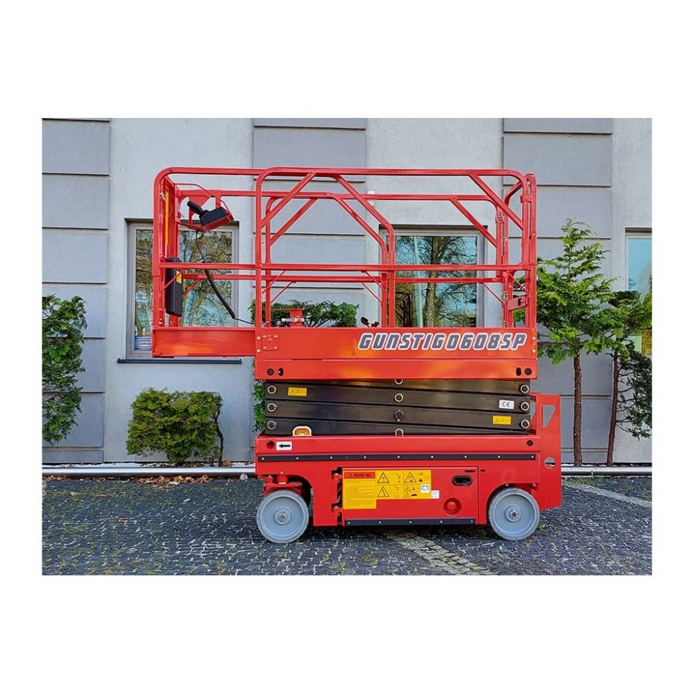 Ножичний підйомник Günstig 0608SP призначений для підйому людей і обладнання на будівництві, в складах та інших сферах, де необхідне виконання робіт на висоті. Розмір підйомної платформи - 1670x740 мм. Висота платформи - 5,8 м, робоча висота - 7,8 м. Розрахований на 2 операторів або на максимальне навантаження 230 кг. Для збільшення робочої зони є висувна платформа довжиною 900 мм, вантажопідйомність якої становить 113 кг.