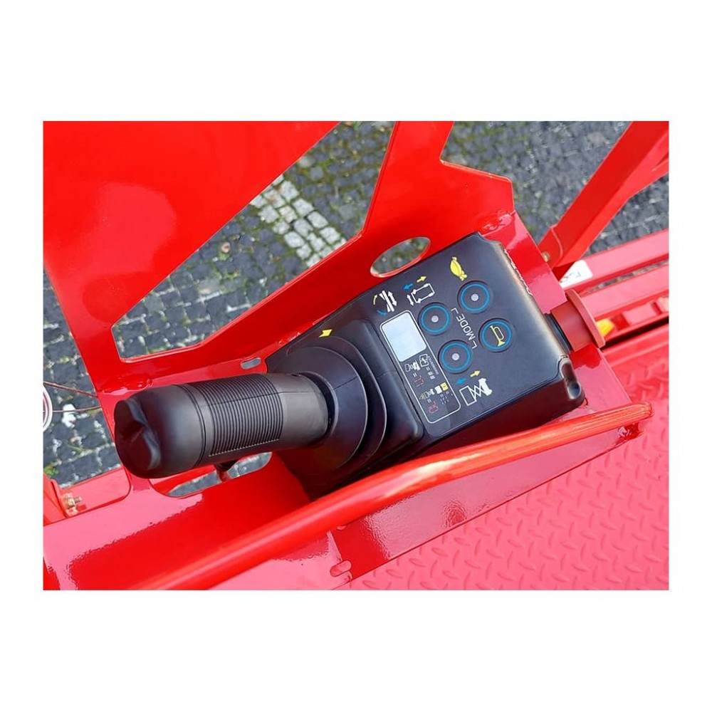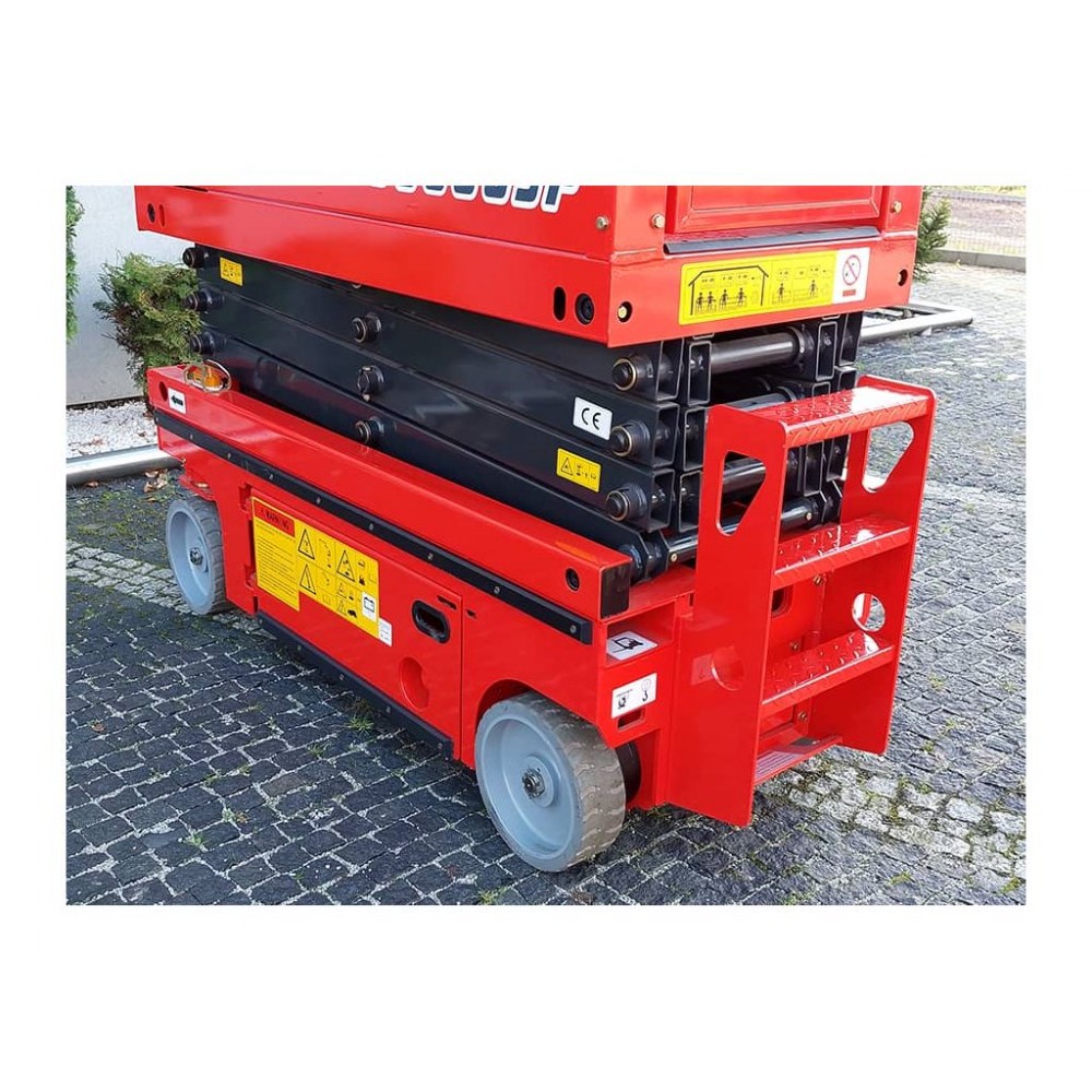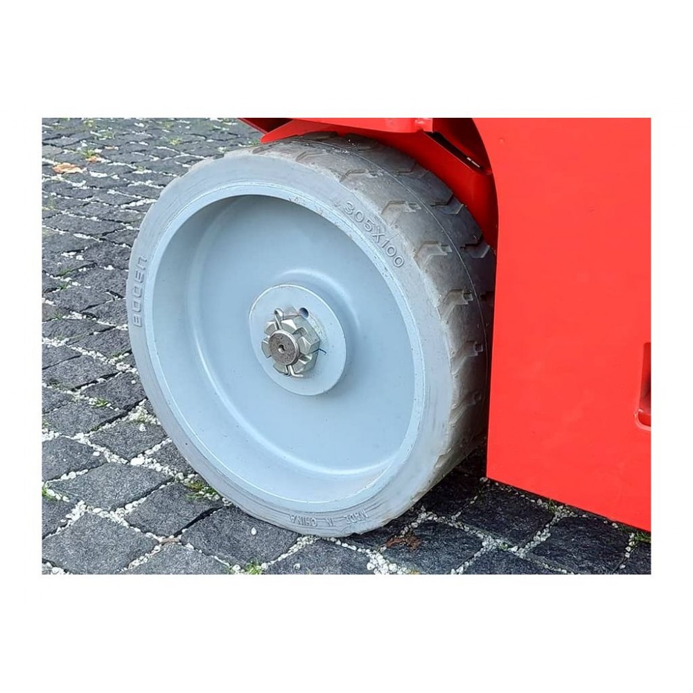 Оснащений електроприводом і 4 акумуляторами 6V/190Ah, які забезпечують живлення всіх функцій підйомника. Для зарядки акумуляторів є вбудований зарядний пристрій 24 В/25 А, який підключається до мережі 230 В. Гумові колеса 305х100 мм і привід 2WD забезпечують плавний рух і дозволяють працювати на схилах до 25%. Управляється цей підйомник будівельний за допомогою джойстика.