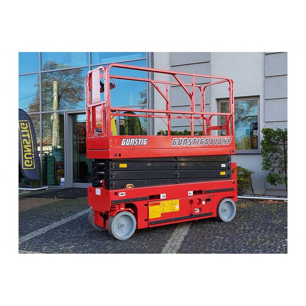Ножичний підйомник Günstig 0810NP з електроприводом - це надійне обладнання для роботи на висоті як у приміщеннях, так і під відкритим небом. Розмір платформи 2270х810 мм і вантажопідйомність 230 кг дозволяють розмістити на платформі необхідне обладнання або одночасну роботу 2 операторів. Висота платформи становить 8 м, робоча висота - 10 м. Для збільшення робочої зони підйомник має висувну платформу довжиною 900 мм, яка витримує навантаження до 113 кг.