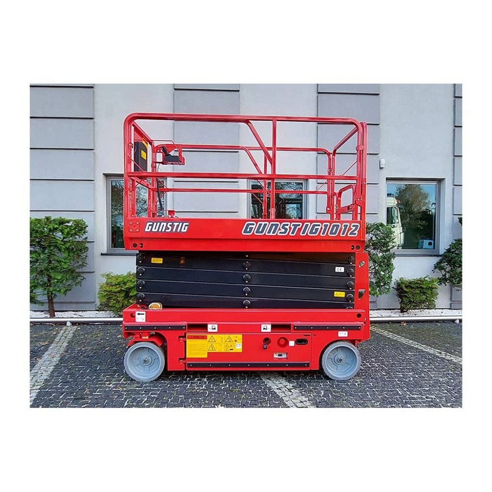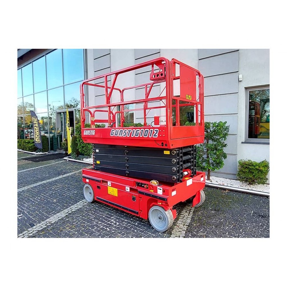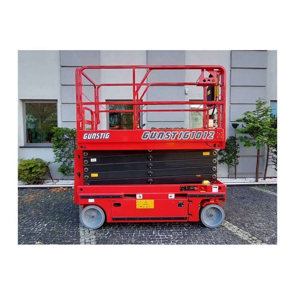 Ножичний підйомник Günstig 1012 з висотою платформи 10 м призначений для роботи на висоті до 12 м. Оснащений електроприводом з живленням від 4 акумуляторних батарей 6 V/210. Для зарядки акумуляторів є вбудований зарядний пристрій 24 V/25 A, який підключається до мережі 230 В. Платформа має розмір 2270х1120 мм і розрахована на 2 операторів. Максимальне навантаження на платформу - 320 кг. Для розширення робочої зони є висувна платформа довжиною 900 мм з вантажопідйомністю 113 кг.