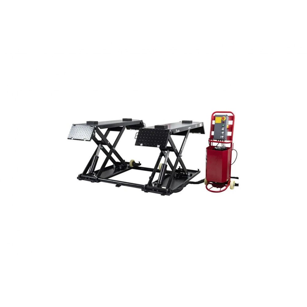 Потужна гідравлічна система забезпечує плавність та контрольованість підйому/опускання, а розкладні рифлені пандуси - легкий заїзд автомобіля на платформу. Довжина платформи без пандусів становить 1480 мм, з пандусами - 2080 мм, тому можна зручно обслуговувати різні типи авто. Окрема панель керування з кнопками для перемикання режимів робить цей мобільний ножичний підйомник зручним і легким в експлуатації.