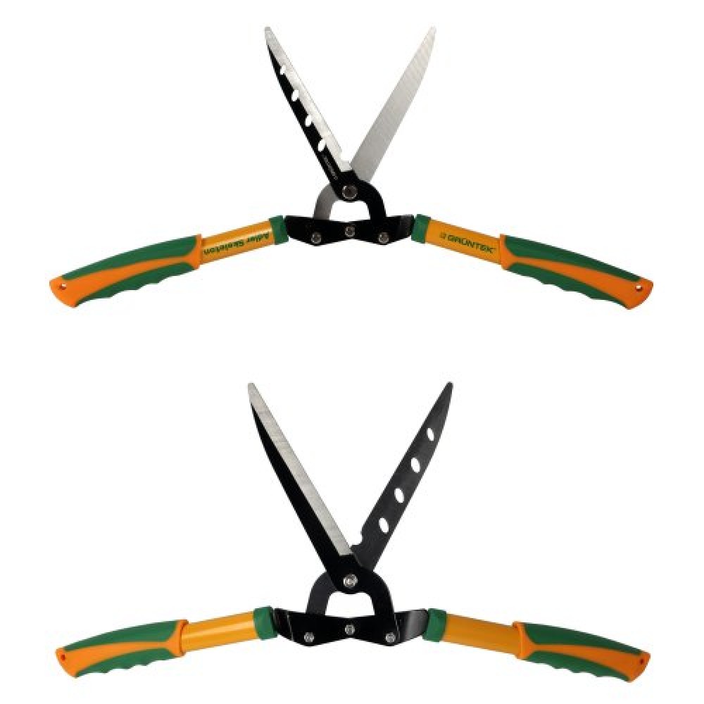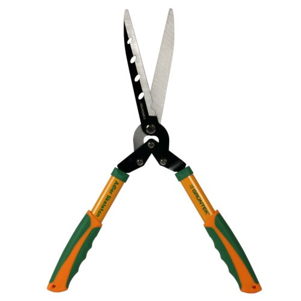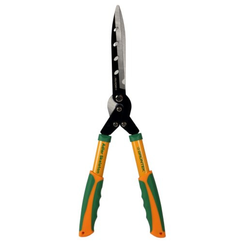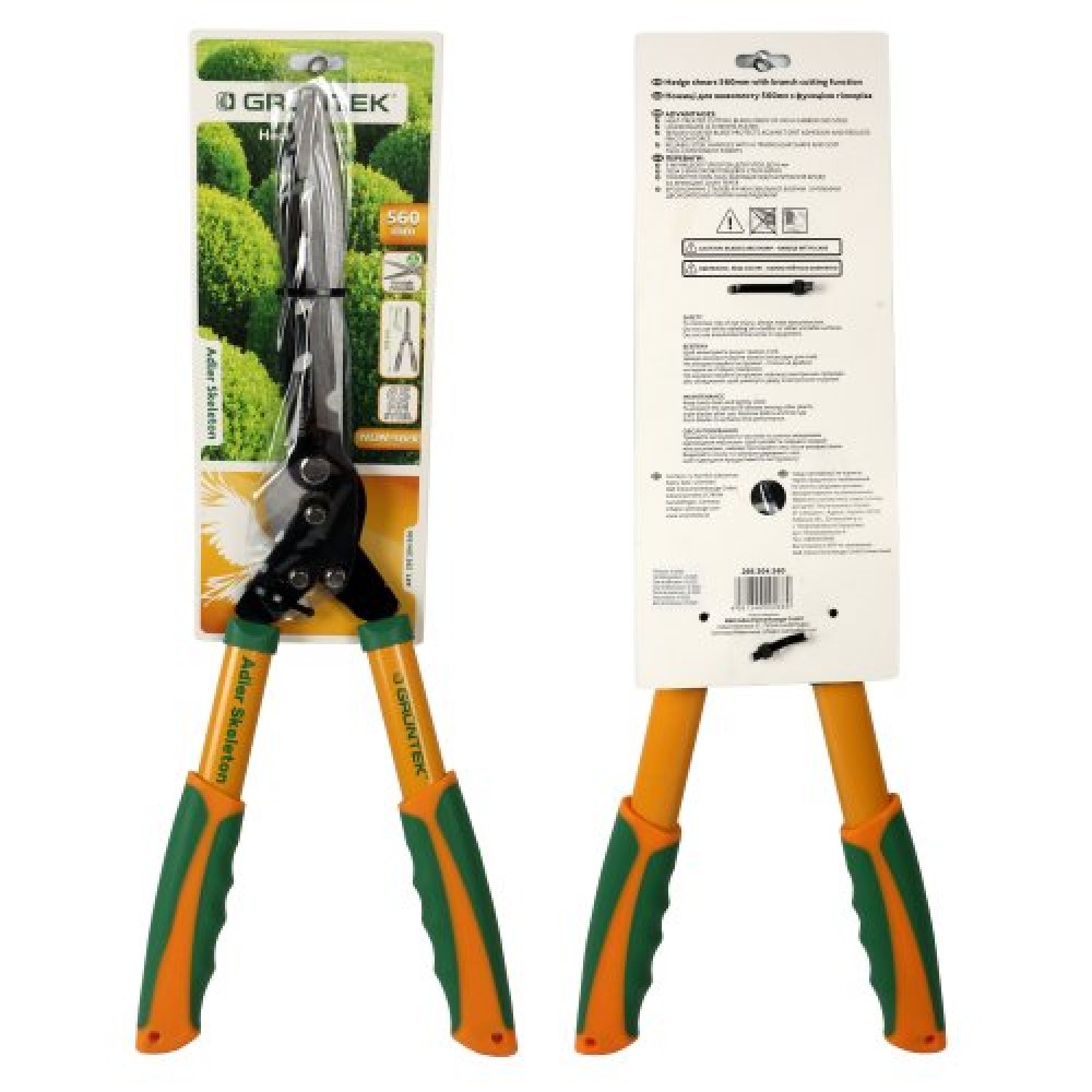 Ножиці для живоплоту GRUNTEK Adler Skeleton 560мм - зручний у використанні садовий інструмент, призначений для підстригання декоративних дерев, кущів, що формують живоплот. Модель має функцію сучкоріза (у лезі передбачено спеціальний отвір для гілок), завдяки чому за допомогою ножиць можна різати гілки діаметром до 6 мм. Користувач зможе швидко та акуратно зрізати зайві гілки на кущі чи дереві.