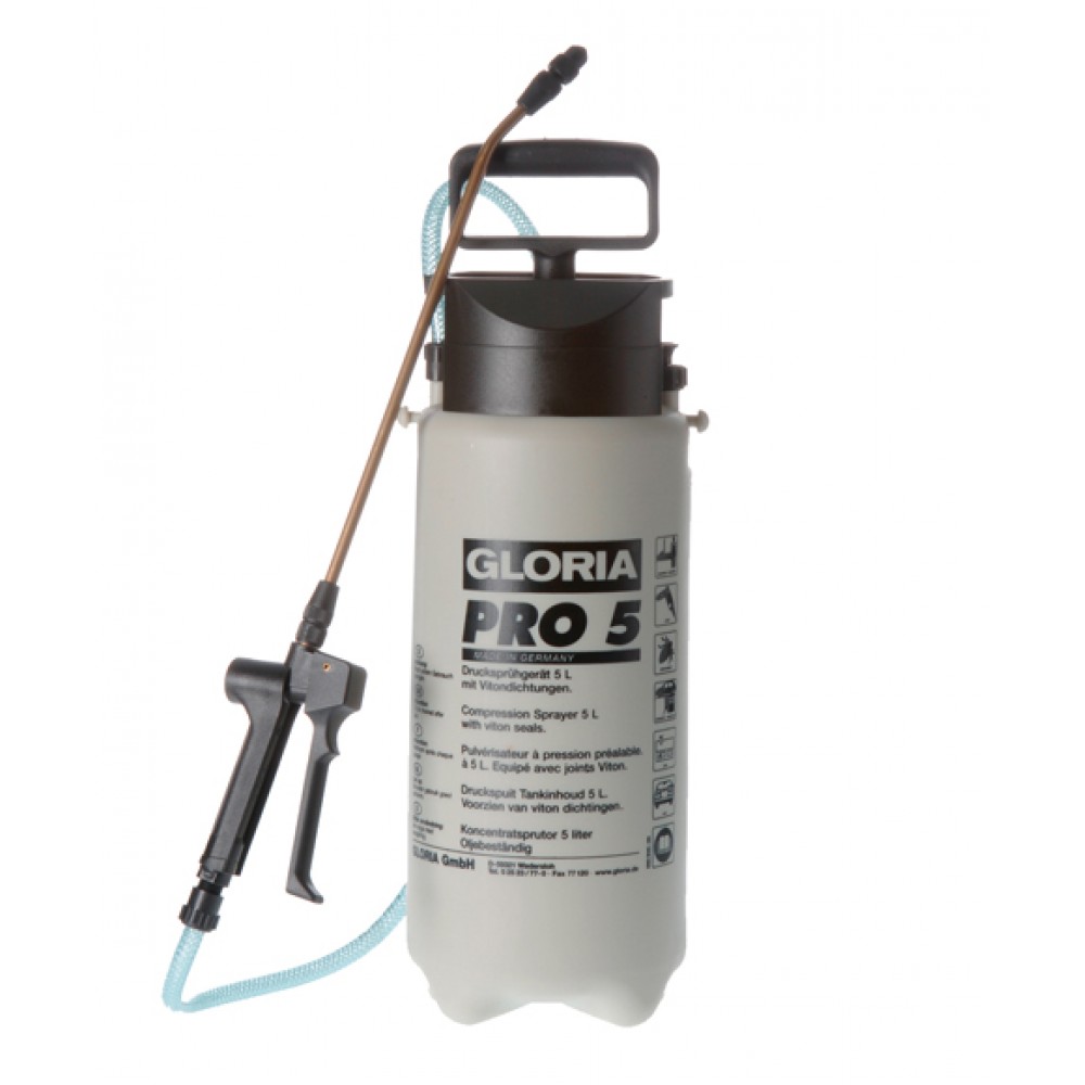 Розпилювач Gloria Pro 5 - пристрій для розпилення фарб на водяній основі. Завдяки робочому тиску 3 бар і ємності 5 л обприскувач забезпечує максимально ефективне і рівномірне розпилення. Обприскувач GLORIA Pro 5 обладнаний стійкими ущільненнями з Вітону, а також розпилювальною трубкою з плоскою струменевою форсункою типу 8002 E.